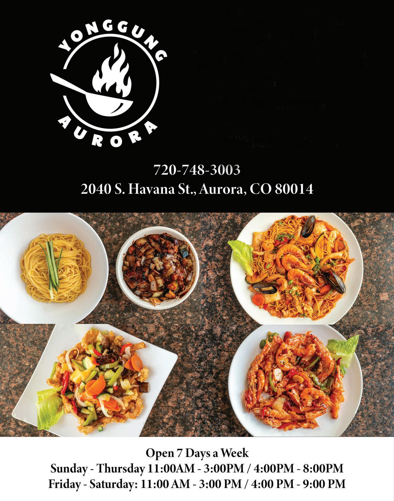 www.FocusColorado.net 7 2023년 3월 2일 l 주간 포커스 전면광고 온라인 주문 YGAurora.com New Management 2040 S. Havana St., Aurora, CO 80014 720-748-3003 용궁 서버 모십니다 Open 7days a week all day 월요일-토요일 11AM~9PM 일요일 11AM~8PM 2병 주문시 1병 Free (Equal or less value, for a limited time!) 런치 스페셜 $10.99~