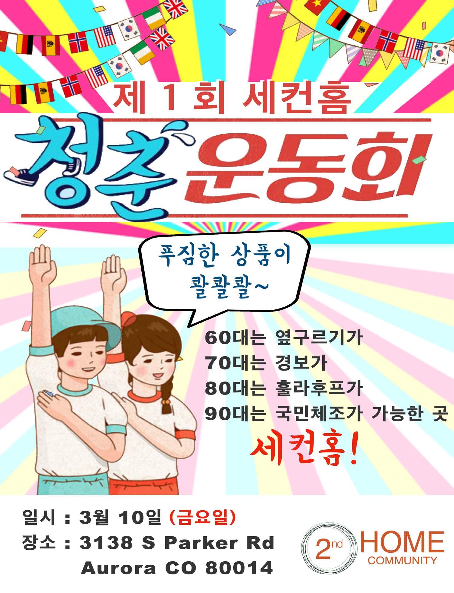 옆구르기, 70대는 경보, 80대는 훌라후프, 90대는 국민 체조로 참가한다. 주소는 3138 S. Parker Rd, Aurora이다.