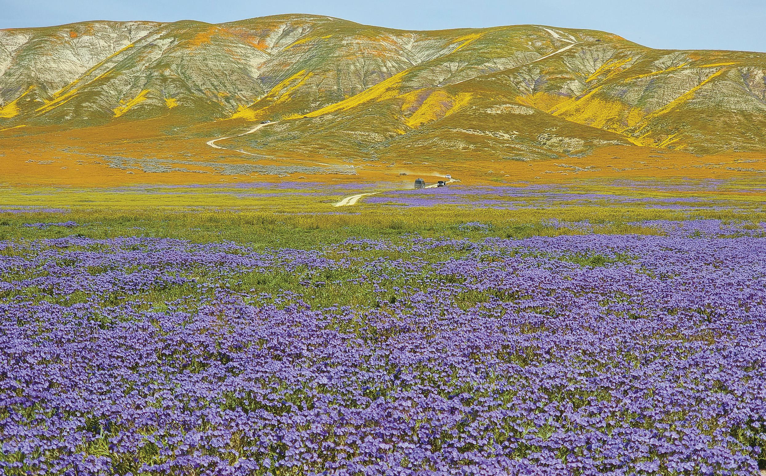생소한 땅이다 하지만 생명이 가득한 초장과 푸근한 지평선을 보면서 무엇인가에 이끌려 옛날 을 그리워하는 향수를 느끼게 하 는 곳이다 2023년에는 카리조 평원과 58 번 국도를 따라 화사한 야생화 수퍼 블룸 물결이 일어났다 긴 운전이긴 하지만 LA에서는 당 일 여행으로 좋은 장소이다