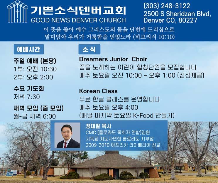 임동섭 김교철 유지훈 이동훈 이두화 조완길 김병수 목사 한용구 목사 선교사 담임목사 담임목사 공동담임목사 담임목사 목사 에콰도르 선교사 세계선교교회 참빛교회 더비전교회 풍성한교회 홍해선교회 믿음장로교회 향기나는 편지 Professional 서비스를 경험하세요. 블루오션으로 선도하겠습니다. 정직과 신용으로 최선을 다하여 봉사하겠습니다. 3090 S. Jamaica Ct. Ste 113, Aurora, CO 80014 Tel : 303-819-7763 지철 CPA 연세대학교 상경대학 졸업 연세대학교 경영대학원 MBA LG 경영대학원 MBA CU Denver MSIS www.icjcpa.com ▶ 각종 세금신고 / 세무감사 대행 ▶ POS / 전산시스템 구축 ▶ 신규회사 설립 서비스 ▶ AML Compliance(첵캐싱 은행서류) Review ▶ 상속 / 증여세 컨설팅 ▶ Payroll ▶ 빌딩 / 사업체 위탁관리 5/25(목) 5/26(금) AURORA, CO 80014 기준 주간 날씨 예보 5/27(토) 5/28(일) 5/29(월) 5/30(화) 5/31(수) 최고 76 최저 50 최고 74 최저 51 최고 73 최저 50 최고 75 최저 50 최고 75 최저 51 최고 72 최저 52 오후 비 오후 비 오후 비 오후 비 약간 흐림 약간 흐림 목차 / 날씨 데스크 칼럼 지역 단신 콜로라도뉴스 미국 / 미주한인뉴스 한국뉴스 월드뉴스 반려동물과 함께살기 연예 / 스포츠 건강 골프 영화 슬기로운 가족생활 쉬어갑시다 신간베스트셀러 / 신간책 벼룩시장 한인업소안내 운세 9 12 14 16,23,24,26,28,36,38,39,40,50,52,54,60,62,64 72,73,74,76 84,86,87 88 97 96,98 99 101 108 109 110,111,112 114 121,122 124,125 126 오후 비 최고 74 최저 51