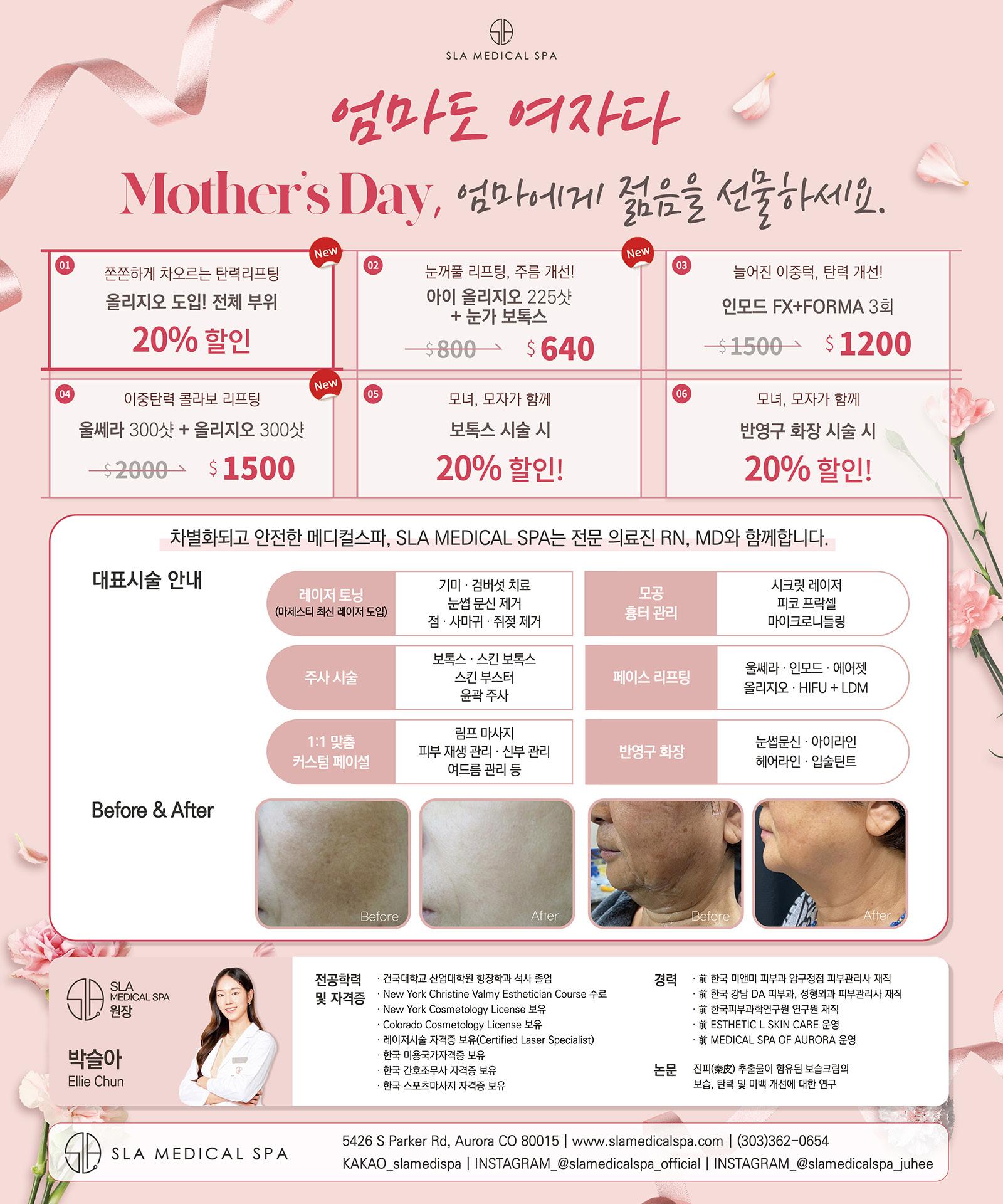 130 May 25, 2023 l Weekly Focus www.FocusColorado.net 전면광고 한국 가실 필요없어요! 수술과 피부 한곳에서 해결! 뉴라인 에스테틱 뽀샤시~ 탱탱!!! 조이고, 올리고, 벗겨주고!!! before after before after 12가지이상 FDA승인 레이저 보유로 효과 극대화 보톡스 필러(실리프팅) 여드름, 확실히 잡아드립니다 색소까지 정복 상하안검, 쌍꺼풀, 안면거상 얼굴 맑게하는 시술, 상처, 딱지없이 '뽀샤시~' 지방 융해ㆍ피부당김 시술(수술/비수술) 7261 S Broadway #101 Littleton Co 80122 11000 E Yale Ave #129 Aurora, Co 80014 문의 303-961-1199 (닥터처방포함) 레이저 스킨케어 before after before after *30%할인