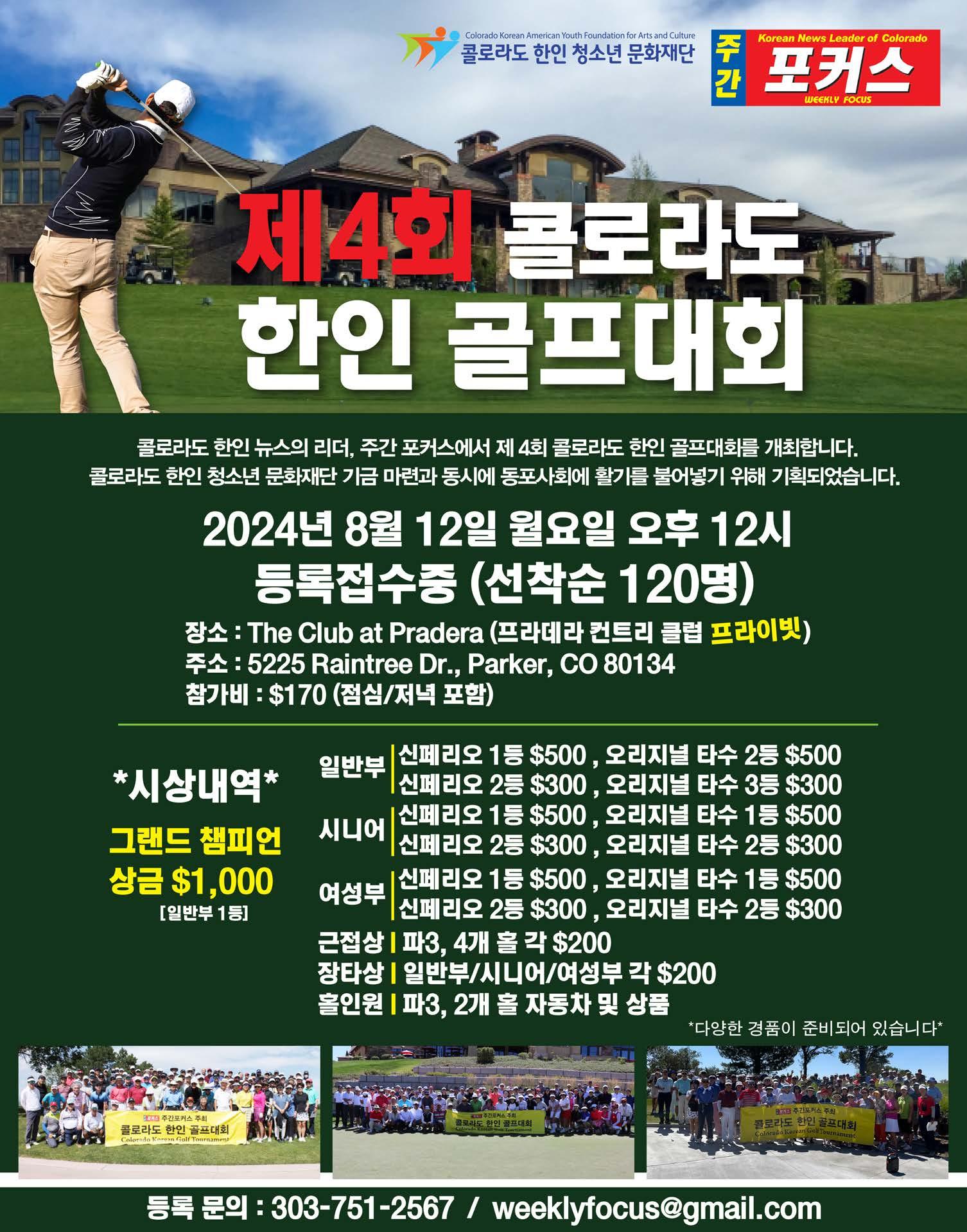 오는 8월12일 월요일 오후 12시 파커에 위치한 프라데라 컨 트리 클럽(프라이빗)에서 열린다. 콜로라도 한미 청소년문 화재단 기금마련을 위해 매년 개최되고 있으며, 참가정원은 120명이다. 문의는 303.751.2567 (주간포커스)로 하면 된다.