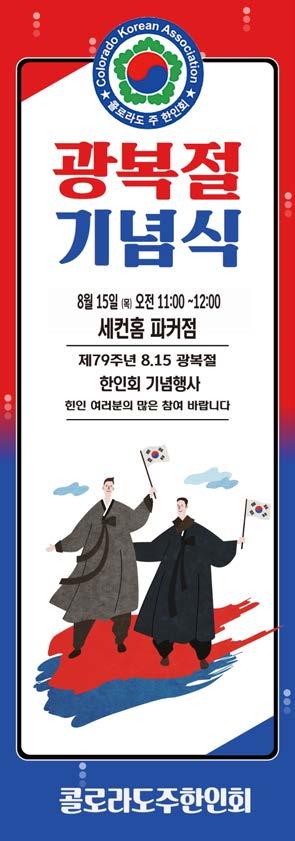 복절 기념식을 8월16일(토) 오전 10시부터 12시까지 Ruth Holly Library에서 개최한다. 행사장 주소는 685 N. Murray Blvd., Platte and Murray, 월마트 빌딩 맨 오른쪽에 위치. 떡 과 과일, 음료가 제공되며, 자세한 문의는 719.936.1616.