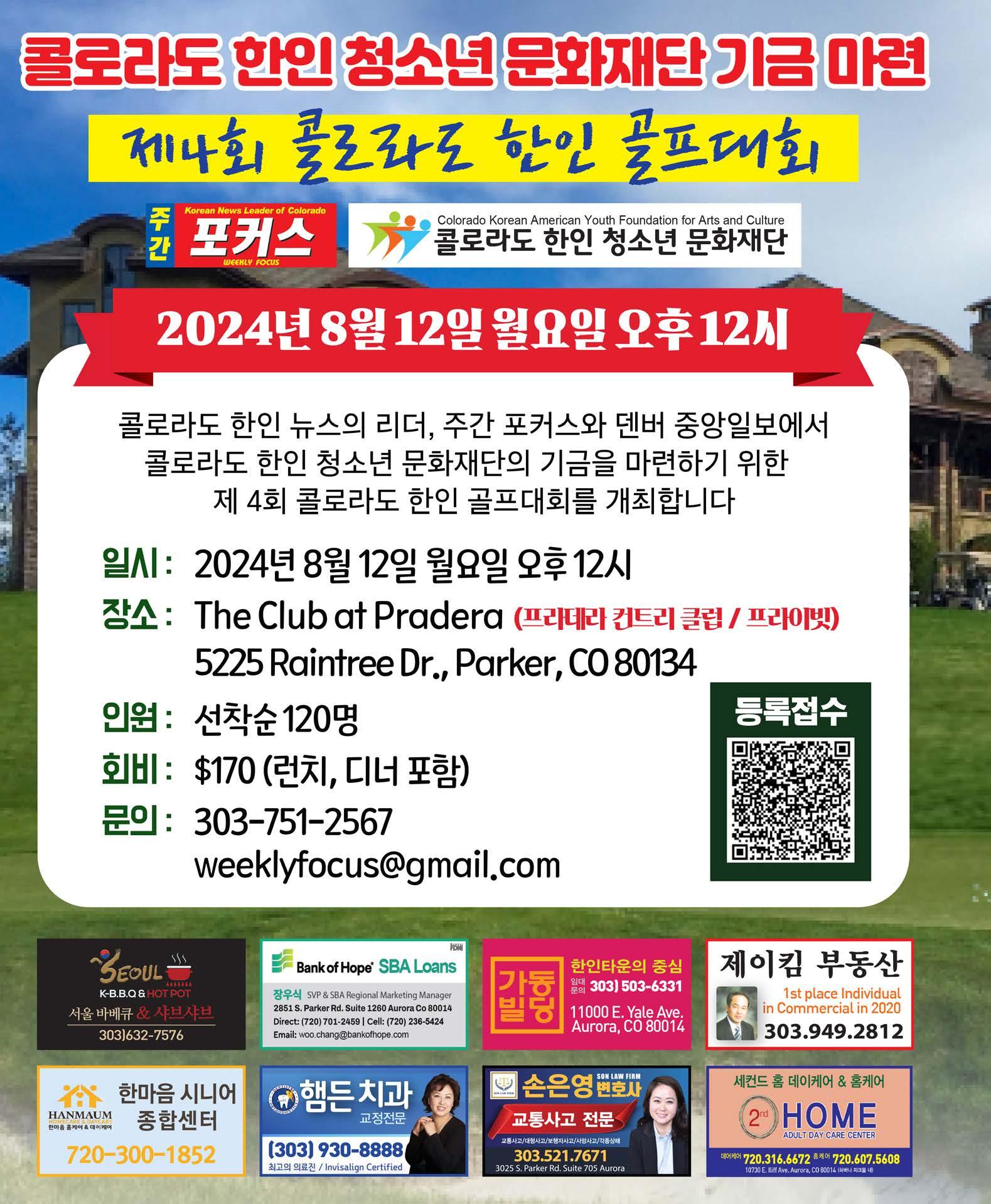 오는 8월12일 월요일 오후 12시 파커에 위치한 프라데라 컨 트리 클럽(프라이빗)에서 열린다. 콜로라도 한미 청소년문 화재단 기금마련을 위해 매년 개최되고 있으며, 참가정원은 120명이다. 문의는 303.751.2567 (주간포커스)로 하면 된다.