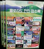 한미 연합회 303-564-4733 호남 향우회 303-667-2605 화목회 골프 동호회 303-921-2934 백년장수온돌침대 703-424-5481 오사키마사지체어 720-487-4455 미래간판 303-704-1979 프로 디자인스 303-743-7446 마당몰 건강식품 720-487-4455 비겐 의료기 720-401-5016 씨앤제이 헬스 (야생천종산삼) 720-345-7119 송보감 876-256-7671 우미노 시즈쿠 후코이단 1-866-566-9191 건우 종합 건축 303-332-3907 거터전문업체 720-400-7372 마이다스 핸디맨 서비스 303-726-2367 미주건설 720-260-2859 쌍둥이 건축 720-318-3407 시티 디자인 건축 (김경) 720-936-4321 씨티 건축 (이규만) 303-906-3861 에이플러스 디자인 건축 720-404-2992 엔도건축&전기 303-766-6982 탑 종합 건축 회사 303-731-7306 포레스트 마루 720-220-9899 프로 핸디맨 720-404-2992 애니 꽃집 303-635-6431 써니 꽃집 720-220-2047 체리크릭 꽃집 303-331-0766 미주 냉동&히팅 720-260-2859 스카이 냉동 & 히팅 720-579-6012 쿨스 냉동&히터 303-585-1292 프로즌 냉동&히터 303-263-7664 패밀리 노래방 303-755-5658 큐 당구장 720-900-3680 세컨드 홈 어덜트 데이케어 센터 720-316-6672 시온홈케어 303-549-6420 에이펙스 홈케어 720-990-0276 은혜 양로 보건센터 303-750-0036 파라다이스 실버타운 303-210-2082 한스시니어학당(넘버2홈케어) 720-300-1852 CDC어덜트홈케어센터 719-466-0350 아시안 베버리지(참이슬) 303-792-3222 오픈 트레이딩(처음처럼) 303-353-4537 OST 아메리카 베버리지(대선) 720-573-8917 다원 떡집 303-369-7890 오복 떡집 303-369-3333 H 마트(오로라 점) 303-745-4592 H 마트(웨스트민스터 점) 720-287-5340 M 마트 303-695-4803 서울 마켓(스프링스) 719-570-9999 스프링스 한국 마켓(스프링스) 719-597-8000 컴포트 인(오로라) 303-755-8000 주간포커스 문화센터 303-751-2567 김건임 미용실 720-318-3408 세라 미용실 720-366-6348 써니 헤어 살롱 303-913-0620 오헤어 미용실 720-427-9358 JP Style 303-369-0369 지오 미용실 303-942-0882 티파니 미용실 303-344-3199 강종원 통역 720-862-8575 국제언어서비스(한기표) 720-937-7570 박안나 통번역 303-359-8838 이윤주 통번역 303-842-5420 이은희 통번역 303-807-6012 이철범 컨설팅 303-564-4733 이하린 통번역 303-870-0103 강주영 변호사 303-297-3200 김병주 변호사 303-558-1075 덴버 상해 법률사무소 303-761-1900 마이클 이 변호사 720-282-8050 마크 라이다 법률 사무소
