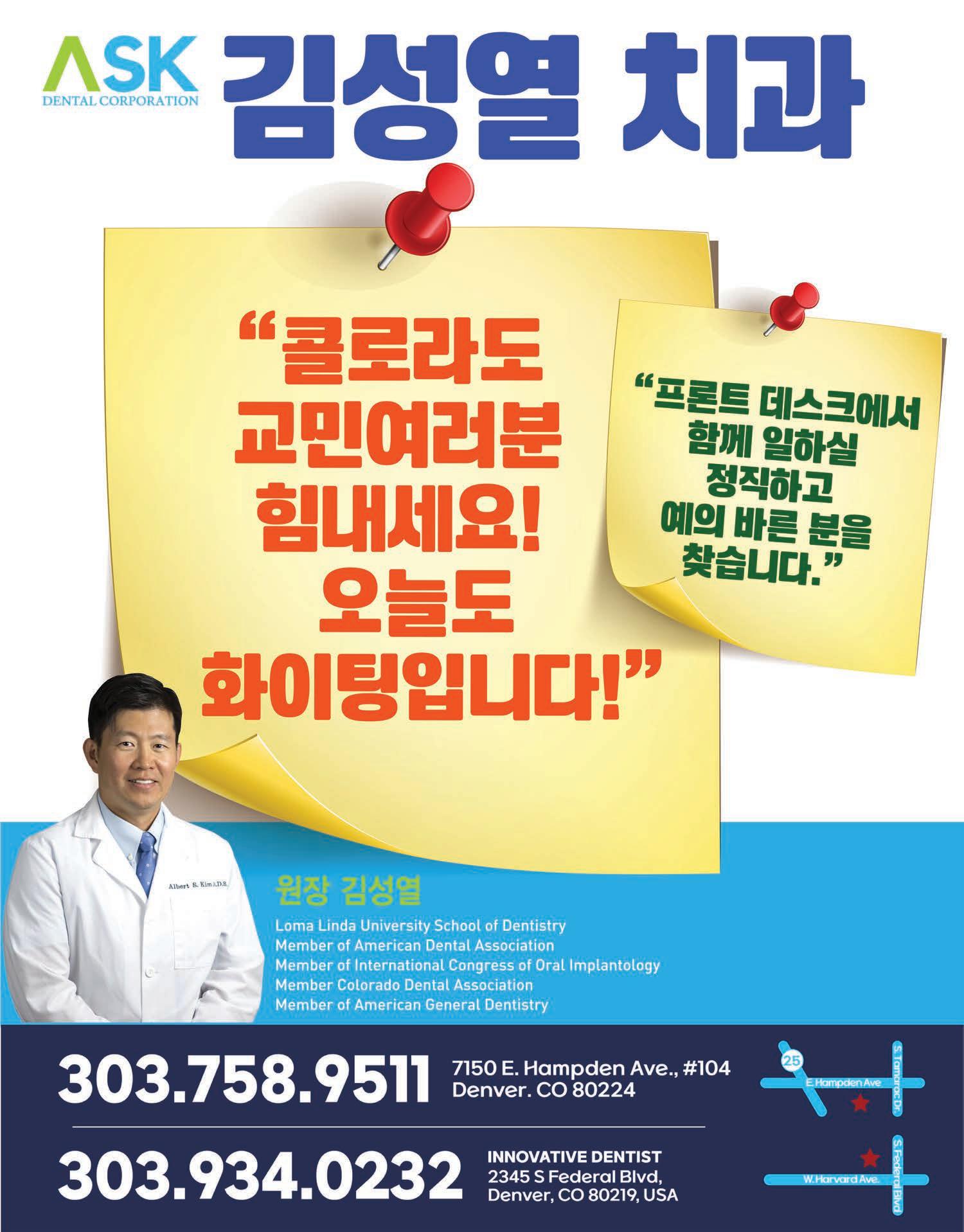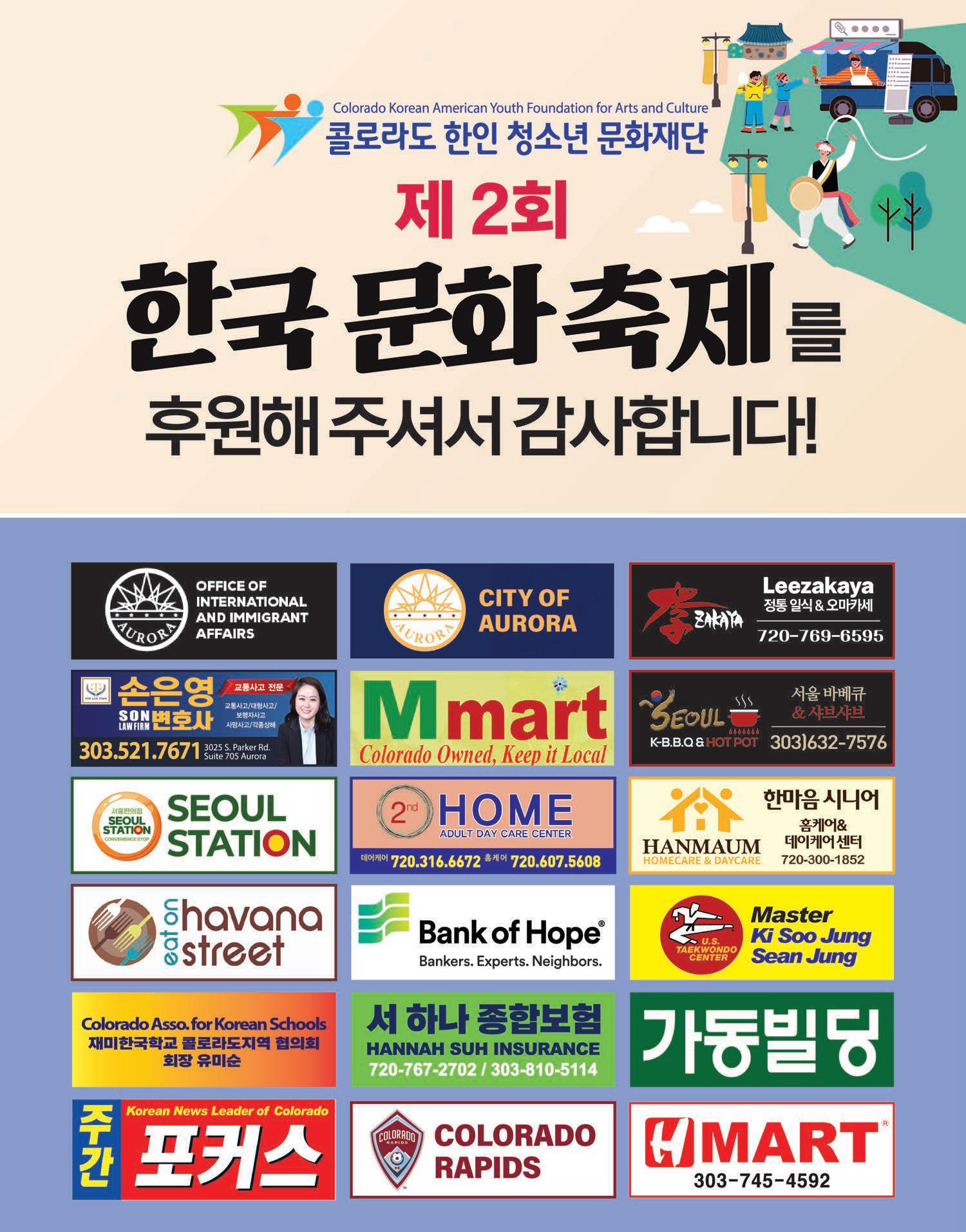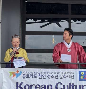 태권도다. 오로라의 유에스 태권도는 콜로 라도에서 가장 뛰어난 실력을 지닌 태권도 데모팀이다. 지난해보다 훨씬 더 많아진 30여명의 관원들이 태권도 퍼포먼스를 선 보였다. 모두가 한국어로 인사를 하고, 한 국어로 노래를 따라 부르고, 한국 가수들 의 춤을 따라하면서 케이 문화에 진정 진 심이었다. 한류의 인기를 눈으로 직접 확 인할 수 있는 시간이어서 뿌듯했다. 행사를 마치면서, 감사할 곳이 너무 많다. 우선 오로라시가 "한국 문화의 날"로 지정 을 했다는 것은 큰 의미이다. 이러한 사안 은 시장 혼자 결정할 수 있는 문제가 아니 다. 시의원들의 동의가 반드시 필요한 사 안이다. 그리고 금전적으로도 후원을 해주 었다. 오로라시에 진심으로 감사하다. 그 리고 필자는 M마트에 감사한 마음도 빠뜨 릴 수 없다. 이번 행사를 위해 초코파이, 컵 라면, 김, 음료수 등을 선뜻 지원해주셔서 더욱 풍성한 축제가 될 수 있었다. 족히 5 백여 명에게 나눠준 것 같다. 마지막으로 애써 준 청소년 문화재단의 이사들과 포커 스 팀에게 감사의 말을 전하며, 내년에는 더욱 알찬 프로그램으로 구성해 추석 축제 를 준비하겠다. 타민족들이 한국에 이렇게 진심인데, 우 리가 더 많은 관심을 가지고, 자랑해야 한 다. 우리 것을 지키고 알리는 데 좋은 아이 디어가 있으면 언제든지 신문사로 연락해 서, 한국 문화축제가 매년 한인사회와 함 께 준비하는 행사가 되기를 바란다. <발행인 김현주>