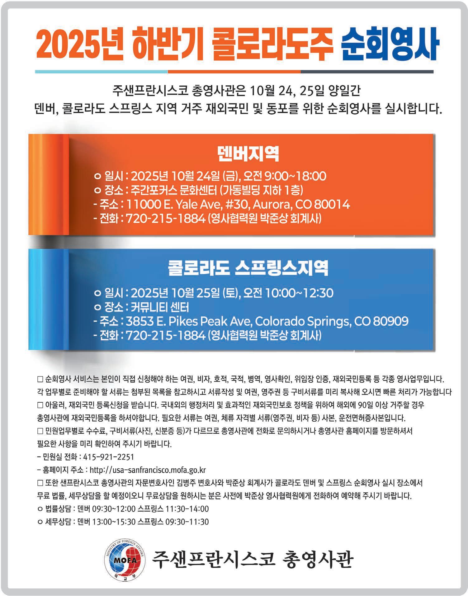 2025년도 상반기 콜로라도 지역 순회영사 업무가 10월24 일(금)과 25일(토) 양일간 진행된다. 덴버 21일 오전 9시부 터 오후 6시까지 포커스 문화센터, 스프링스는 오전 10시 부터 오후 12시30분까지 조이시니어센터에서 에서 각각 열릴 예정이다. 영사관 민원실 문의는 415.921.2251 이다.