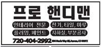 콜로라도 한인 비즈니스 전화번호 안내 한인 전화번호 안내는 독자 여러분들의 편의를 위해 무료로 제공되는 지면입니다. 업체의 정보가 틀렸을 경우 신문사로 연락주시기 바랍니다. 12000 E 16th Ave #305, Aurora, CO 80010 Tel.303.505.3375 (Wan Kim) kimwan11555@gmail.com 주택식당 커머셜 빌딩 호텔 모텔 지반(Foundation)부터 지붕(Roofing)까지 건축에 관한 모든 것 “K ALL in One 건축”에 문의하십시오! 속 시원하게 해결해드립니다. 시원하게 의류/수선 이사 자동차 판매 전기/수리 종교기관/기독교 종교기관/천주교 종교기관/기타 크레딧 카드 기계 태권도 택시 페인팅 학교/학원 한의원 회계사 자동차정비/틴트 제과점