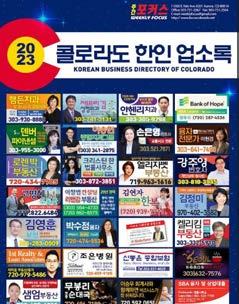 보답하겠다”고 밝혔다. 2023년 한인업소록은 지난해와 동일한 388페이지로 구성되어 있으 며, 한인사회에 꼭 필요한 마트, 식당, 미용실, 학교, 병원을 비롯하여 여행, 이민, 법률 등 각종 유용한 생활정보 를 가득 담았다. 또, 각 업소의 특성 에 맞도록 광고를 디자인하고 배치하 여 광고 효과를 극대화하는 한편, 광 고 하나만으로도 이용자들이 필요한 내용을 얻을 수 있도록 했다. 포커스 업소록의 또 하나의 강점인 부록에는 콜로라도 온천, 골프장, 스키장, 관광 정보 등 콜로라도에 특화된 내용들로 채워져 있다.
