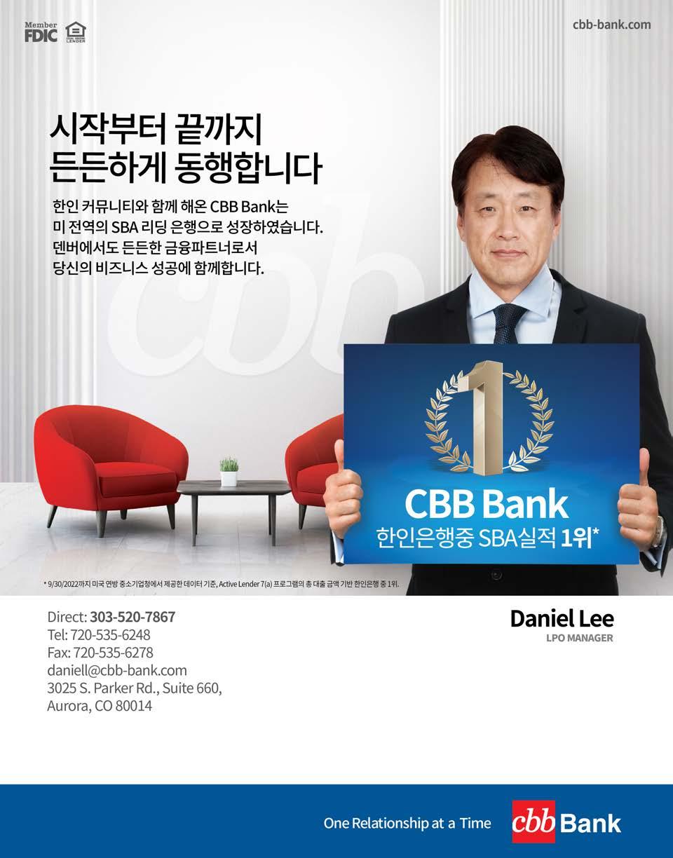 www.FocusColorado.net 135 2022년 12월 29일 l 주간 포커스 전면광고 • SBA자체 승인 대출기관(PLP Lender)으로서 신속한 결정 • 장기 융자기간 제공(부동산 융자 25년, 비즈니스 융자 10년까지) Bank of Hope SBA Loans* SBA Preferred Lender l bankofhope.com 장우식 (Woo Shik Chang) SVP & SBA Loan Production Offi ce Manager 2851 S. Parker Rd. Suite 210, Aurora, CO 80014 Direct (720) 287-4536 Cell (720) 236-5424 Email woo.chang@bankofhope.com • 낮은 다운 페이먼트 부담(부동산 융자일 경우 최저10%) • 분할상환 스케쥴융자(만기 일시 상환이 아님) 및 클로징비용 대출 가능 * 모든 관련 조건 및 약관은 융자진행 및 신용 승인 결과에 따라 달라질 수 있습니다.
