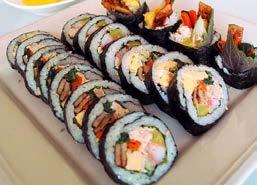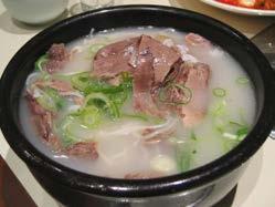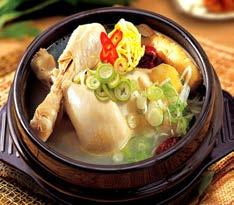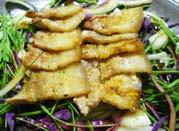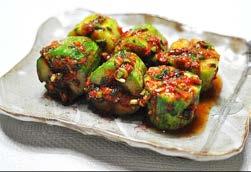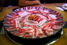 Samgyeopsal is a popular Korean dish. Commonly served as an evening meal, it consists of thick, fatty slices of pork belly meat (similar to uncured bacon). The meat, usually neither marinated nor seasoned, is cooked on a grill at the diner’s table. Usually diners grill the meat themselves and eat directly from a grill. Lettuce, sliced raw garlic, sesame leaves, sliced green chili peppers, sliced raw onions, and/or aged kimchi is common ingredient to eat with Samgyeopsal. 김치