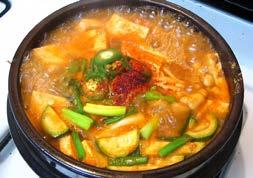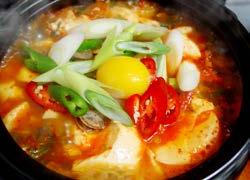 Kimchi Jjigae is a variety of stew-like Korean dish made with kimchi and other ingredients, such as scallions, onions, diced tofu, port or seafood. It is often cooked with more fermented and “ripe” kimchi to create a full and rich flavor. Like many other Korean dishes, it is accompanied by various side dishes and rice. It is usually cooked and served boiling hot in a stone pot.