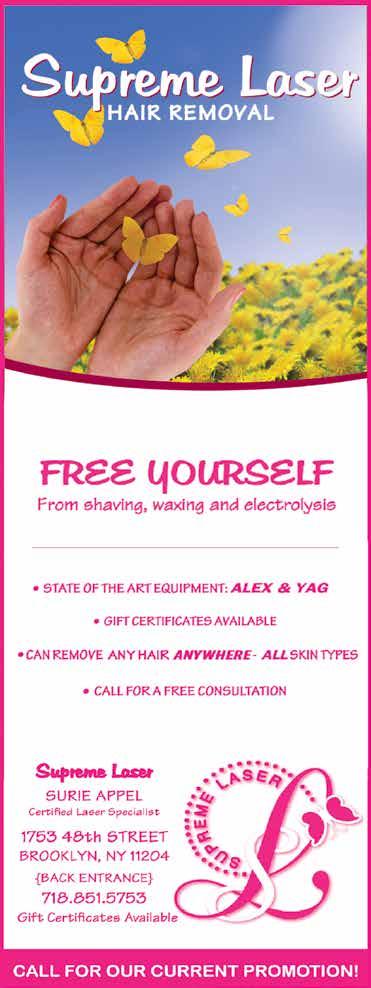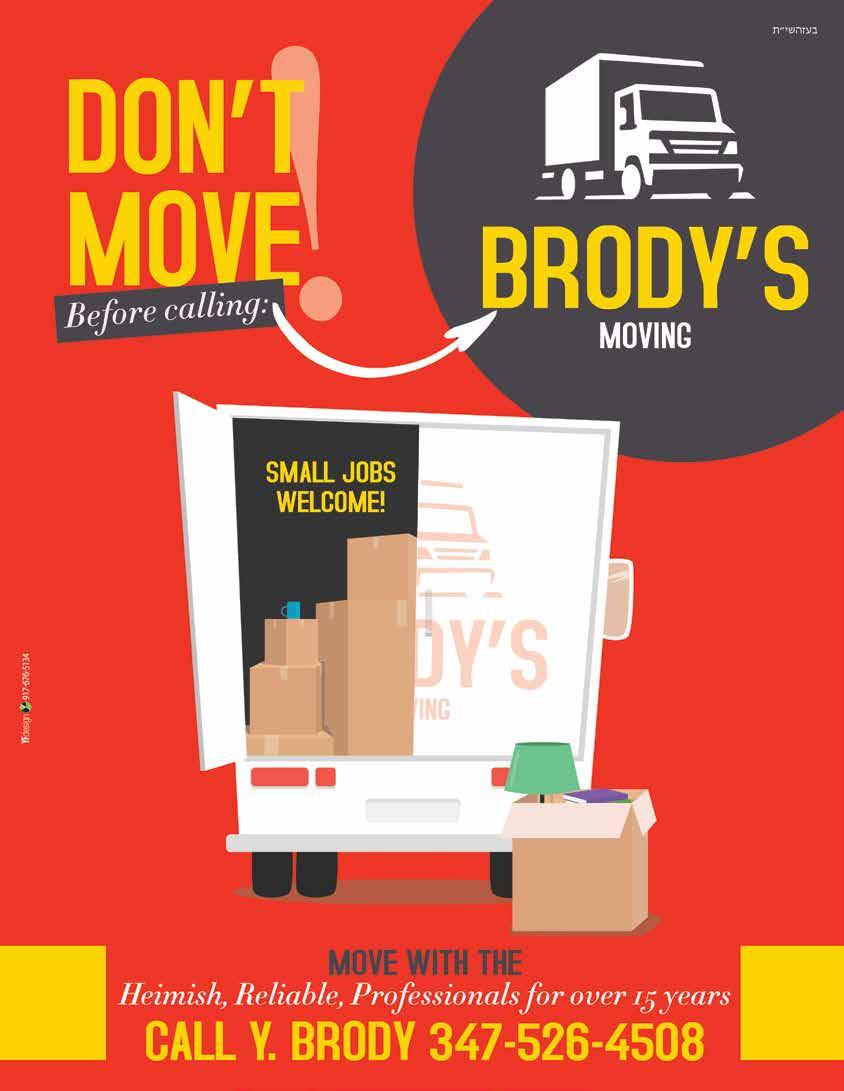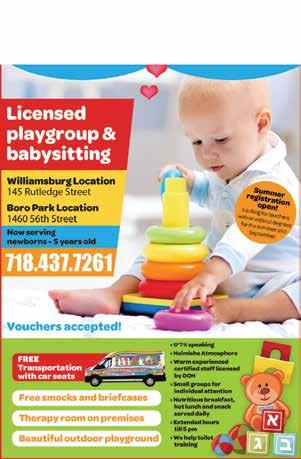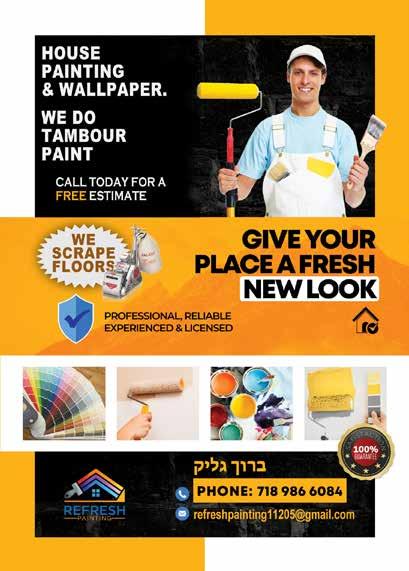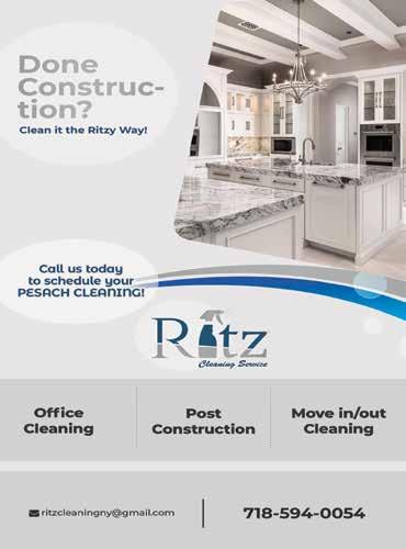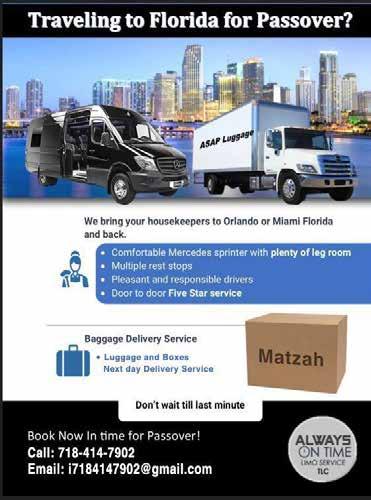 Ready to go 24HOUR SERVICE! $2.99 RASHI LIGHT RED OR LIGHT PINK CONCORD 750 ml • Per bottle by the case of 12 bottles TOPS WINE & LIQUOR 2812 Ave. U See Page 52-53 ד סב RUBIN'S DRYER VENT CLEANING SERVICE 800.310.7856 Call us today to make an appointment! SPRING VALLEY 268 W ROUTE 59 845.425.7900 MONROE 386 ROUTE 17M 845.738.3001 LAKEWOOD 202 MAIN STREET 732.RENT.A.CAR 736 8227 BORO PARK 4919 20 AVE. 347.704.3000 BAY RIDGE 8901 4TH AVE 347.704.3000 WILLIAMSBURG 547 PARK AVE. 347.704.3000 www.ezrentacarny.com DIRECT BILLING YOUR INSURANCE ONE WAY RENTAL AVAILABLE FREE PICK UP SERVICE 347.878.7445 OPEN LATE HOURS / CALL OR TEXT: 1303 53rd St. Tel: 718.633.6412 Fax: 718.633.6414