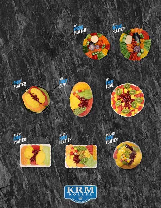Herring and Egg Platter 9x13 Platter $50 Wrap Platter 12”-5 Wraps-25 Bites 14”-7 Wraps-35 Bites 16”-10 Wraps-50 Bites 18”-13 Wraps 65 Bites $50 $70 $100 $130 12”-6 Assorted Rolls 14”-8 Assorted Rolls 16”-10 Assorted Rolls 18”-13 Assorted Rolls Deluxe Sushi Platter Sushi Platter $55 $70 $90 $110 $180 Gefilte Fish Platter $55 $80 $110 10 ”- 5-7 S e r vin g s 12 ”- 8-10 S e r vin g s 16 ”- 15-20 S e r vin g s Spread Platter $35 $50 $90 Fish Ball Platter 12”x12” Platter 16”x16” Platter Lemon and Spice $130 Sesame Teriyaki $130