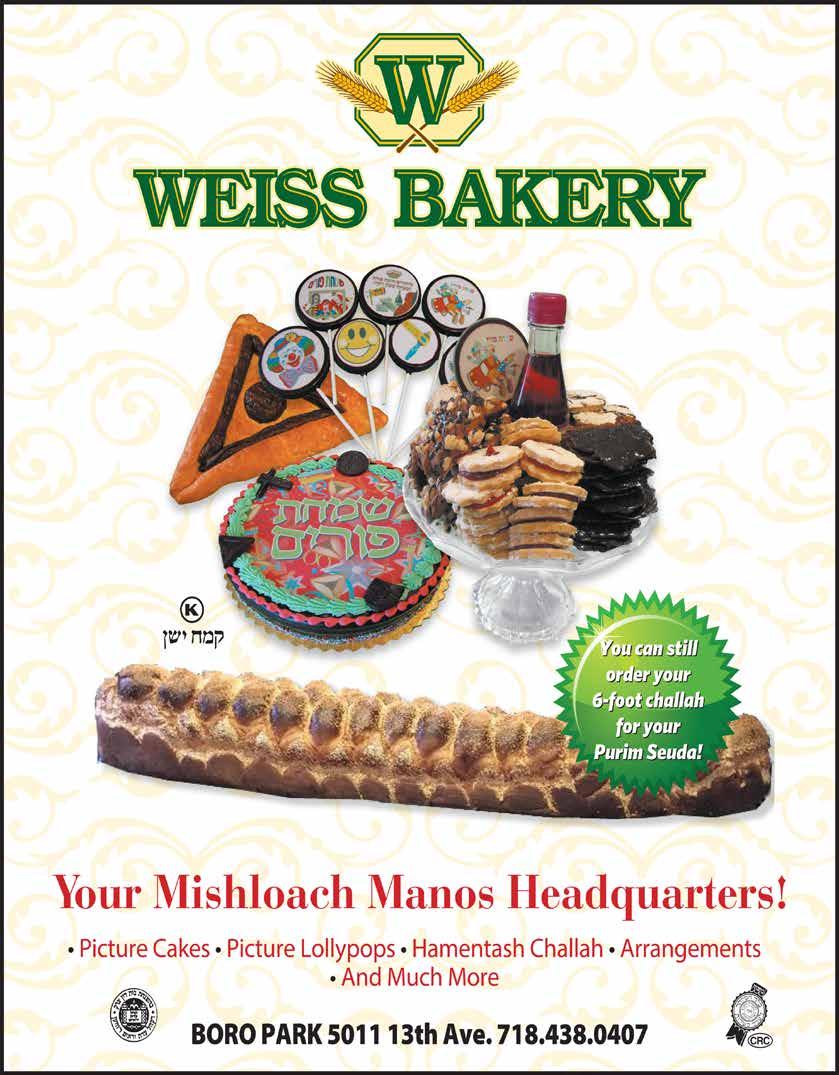 Sale items limited to 3 per family with $10 non-sale purchase. Any items from meat department, eggs, grape juice, newspapers or Oh Nuts are not included in the $10. Not responsible for errors. No rain checks. PARKING! Right Next Door to Our Store 1333 39th St. BORO PARK FLATBUSH & CROWN HEIGHTS 2 hours before closing 3 hours before closing DELIVERY HOURS EXTENDED PURIM HOURS Wed, 3/1: 8:00am-11:30pm Thur, 3/2: 7:30am- 12:30am Fri, 3/3 :7:30am- 2:45pm M. Shabbos, 3/4: 8:30pm-12:00am Sun, 3/5: 8:30am-11:00pm Mon Tanis, 3/6: 8:00am-5:00pm Tues, Purim, 3/7: 9:00am-12:00pm Wed, Shushan, 3/8: 8:00am-11:00pm