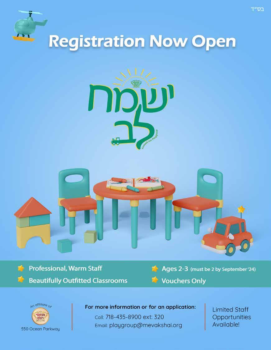 Where children are fed (more than just warm lunches), A WARM PASSION FOR YIDDISHKEIT דניק רעדעי ואוו טשינ ,טמוקאב ,תועידי רעמ ראנ קאמשעג א ראנ !טייקשידיא ןיא GAN YISROEL PRESCHOOL ה"עב LIMITED SLOTS AVAILABLE! DoortoDoorTransportation Registration now open! Free Tuition for children born in 2020 and 2021! Boys Nursery & Kindergarden 718 853 9853 1150 Ext.