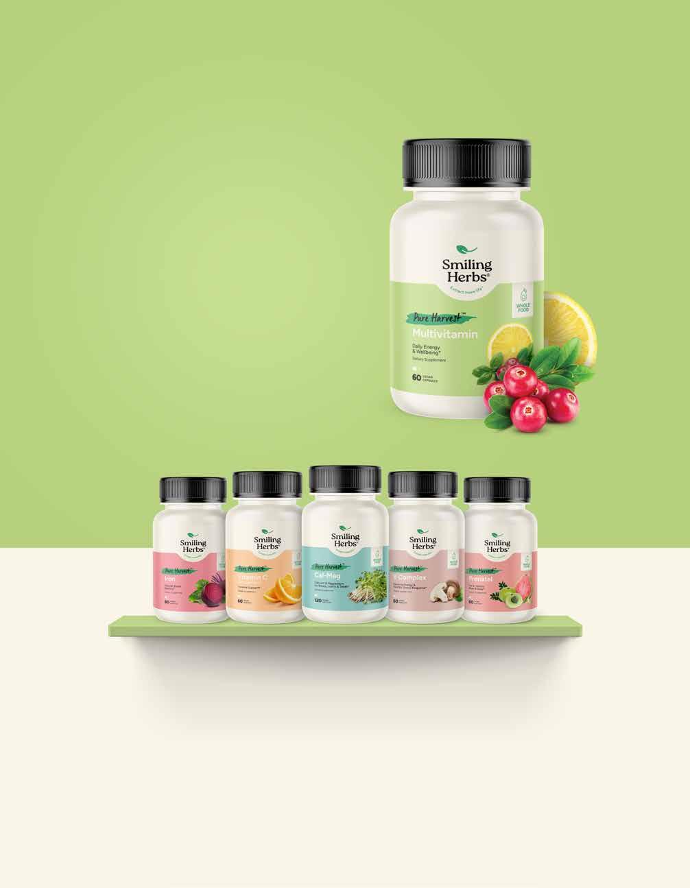 Pure Harvest™ Multivitamin encapsulates 18 vitamins and minerals, including 1000 IU of Vitamin D3, and absorbable, bioavailable B vitamins. A dose of two capsules provides 100% of the recommended daily value.