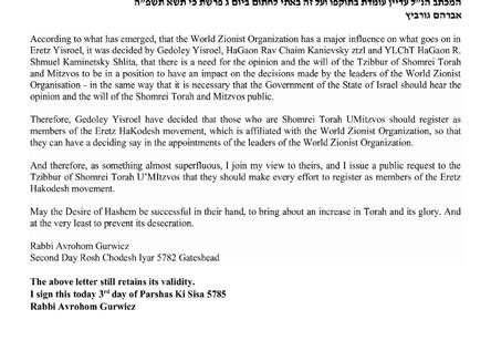 "To my dear friends in the USA, In the upcoming elections, I give my full support and encouragement to Eretz HaKodesh. I know these people, and I follow their activities that create tremendous influence on the future of Yiddishkeit in Eretz Yisroel. Therefore, I ask everyone who can, to vote for Eretz HaKodesh and assist them in bringing kedusha to Eretz Yisroel. This is what Hakadosh Baruch Hu asks of us, to keep Eretz Yisroel kadosh: 'And you shall be to Me a kingdom of priests and a holy nation.'"