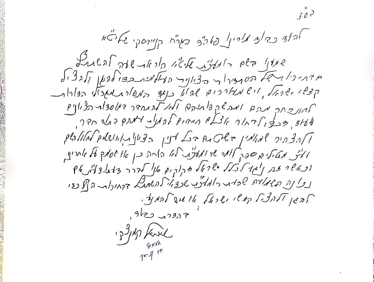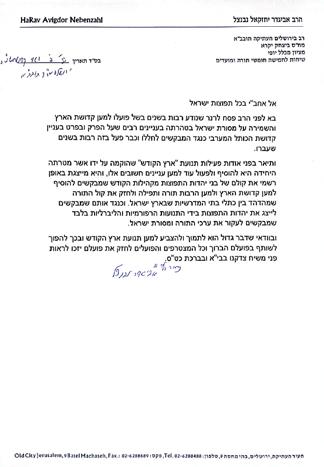 To our brothers, the children of Klal Yisroel in all the diaspora, Rabbi Pesach Lerner, who is known for many years for his work for the kedusha of Eretz Yisroel and the protection of the mesorah of Klal Yisroel in many areas, and especially regarding the holiness of the Kosel against those who seek to desecrate it, and has already done much in this in past years, has come before me. He described to me about the activity of the 'Eretz HaKodesh' movement that was established by him, whose sole purpose is to continue and act further for these important matters, and it officially represents the voice of the Jews of the diaspora from the Torah communities who seek to add to the kedusha of the land, and to increase Torah and tefila and to strengthen the voice of Torah that echoes between the walls of the Batei Medrash in Eretz Yisroel. And against those who seek to represent the Jews of the diaspora by the Reform and liberal movements only, who seek to uproot the values of Torah and the mesorah of Klal Yisroel. And certainly it is a great thing to support and vote for Eretz HaKodesh and thereby become a partner in their blessed work. And all who join and act to strengthen their work will merit to see the face of our Moshiach Tzidkeinu speedily in our days and in the blessing of all good things.