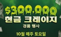 10월매주토요일마다30만달러현금열풍경품에참여할수있습니다!오후7시부터11시까지매시간 매주행운의당첨자5명이만달러의현금을집으로가져갈수있습니다.또한총100명의당첨자에게 천달러의현금이제공됩니다그외에도