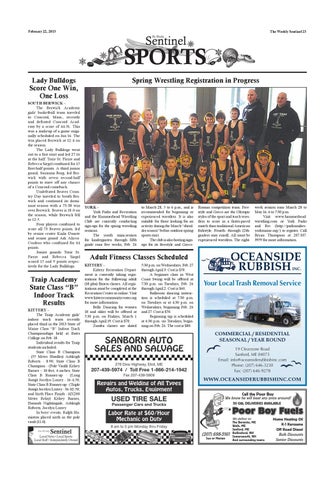 SPORTS lady Bulldogs Score One Win, One loss SOuTH BerWICK – The Berwick Academy girls’ basketball team traveled to Concord, Mass., recently and defeated Concord Academy by a score of 44-31. This was a makeup of a game originally scheduled on Jan 16. The win placed Berwick at 12-4 on the season. The Lady Bulldogs went out to a fast start and led 27-16 at the half. Torie St. Pierre and Rebecca Siegel combined for 15 first-half points. A third junior guard, Suzanna Borg, led Berwick with seven second-half points to stave off any chance of a Concord comeback. Undefeated Beaver Country Day traveled to South Berwick and continued its dominant season with a 73-38 win over Berwick. Beaver is 18-0 on the season, while Berwick fell to 12-5. Four players combined to score all 73 Beaver points, led by senior center Kaila Duarte and senior guard Adi AliceaCordero who combined for 44 points. Junior guards Torie St. Pierre and Rebecca Siegel scored 15 and 9 points respectively for the Lady Bulldogs.