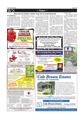 munity,” she said. The third new garden is Golden Meadows Garden Design and Daylillies of Somersworth. Cathryn Norris, owner of The Violin and Fiddle Studio in Rollinsford, has once again organized local musicians to play in the gardens. They are Sheila Rogers, Lindsey Pence, David Ramsey, Christine QuinnThibodeau, Barbara Lang, Sheila Lebarge, Richard Fogarty, Dee McEneaney and Elizabeth Little. Tickets and brochures for the event are $12 in advance at the library and at FriendsofSouthBerwickLibrary.org or $15 at the library on July 13. All proceeds go to the Friends of South Berwick Library, which has raised $850,000 towards its $1.1 million goal to help renovate and furnish the new facility on Young Street.