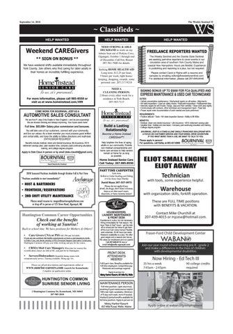 HELP WANTED NEED STRONG & ABLE DECKHAND to work on my lobster boat out of Perkins Cove, Ogunquit, October 1 through end of December. Call Eric Brazer 207-361-7686 for details. Seeking HOME HEALTH AID Long term, $12.25 per hour, 5 hours per week, light housekeeping, shopping, errands, some personal care. 207-217-9218 NEED A CLEANING PERSON: 2 Hours every other week for a residence at York Beach. 207-363-7113