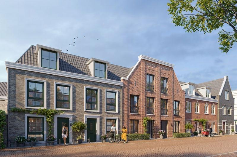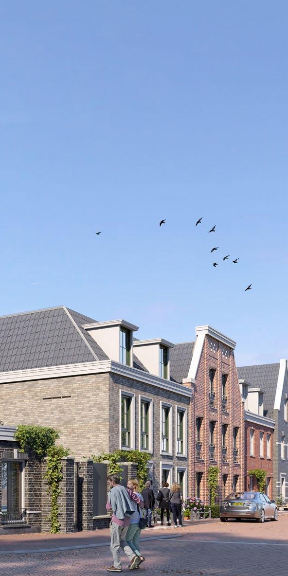 voortuintje nodigen bewoners uit om buiten te leven en buren te ontmoeten. Hier gaat de architectuur meer een relatie aan met de omgeving. De langskappen verbinden de fraaie rijtjes, hier en daar onderbroken door een dwarse kap. De woningen zijn mooi gematerialiseerd. Dit zie je terug in de verschillende type metselverbanden in een variatie aan kleuren. De rijke detaillering van de woningen manifesteert zich in de Franse balkons, de fraaie gevellijsten en ornamenten zoals muurankers. Om de zoveel rijtjes woningen hebben we steeds een mooi vormgegeven poortje of doorgang ontworpen via welke je het gezamenlijke binnenterrein betreedt. We kunnen niet wachten om straks het resultaat te zien.’