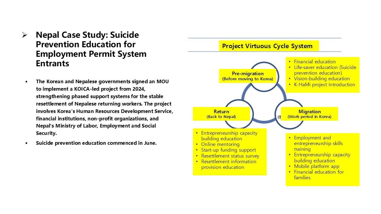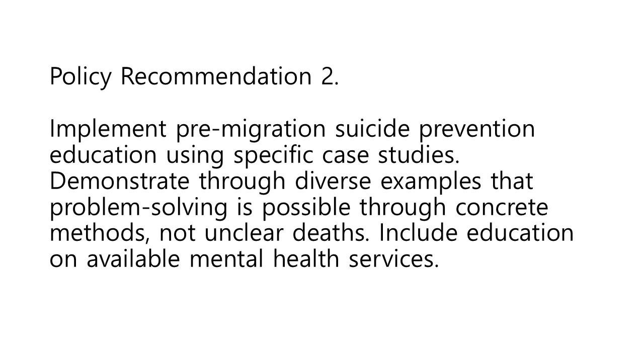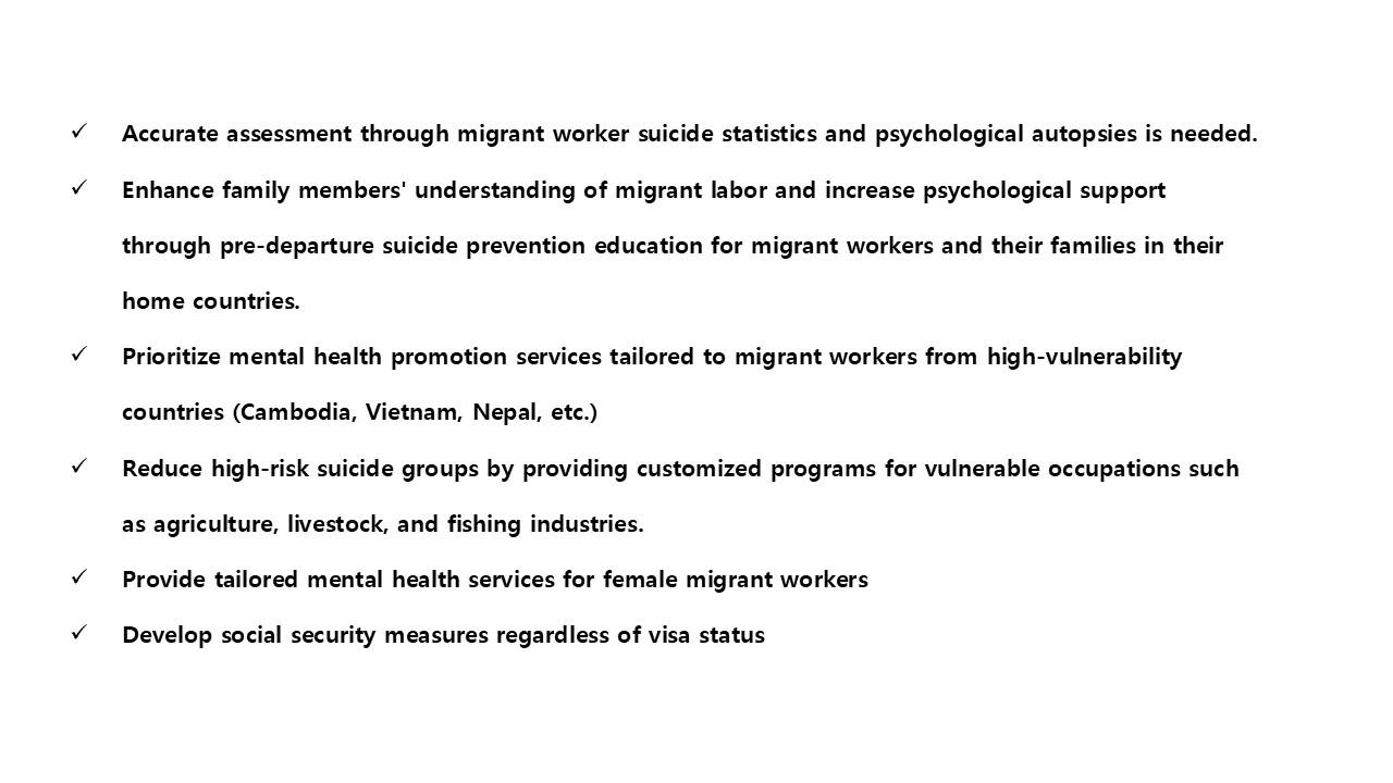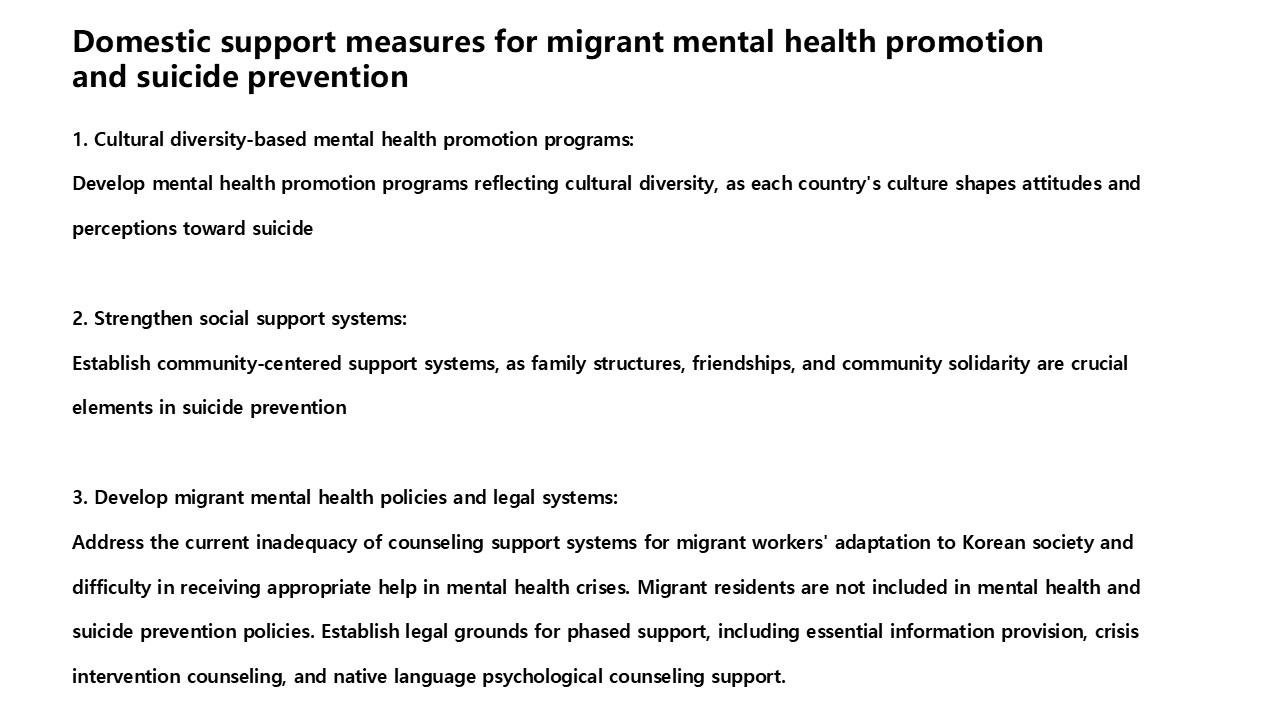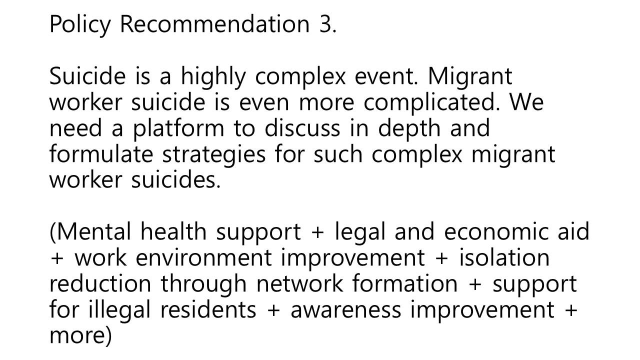 ❏ 네팔 노동자를 포함하여 이주노동자 정신건강 및 자살 예방을 위해 무엇이 필요한지 정 책적 접근과 민간 지원에 대해 몇 가지 제언하겠습니다