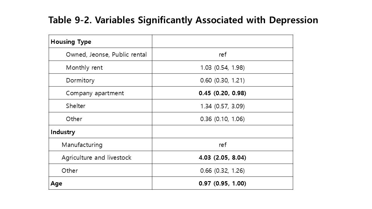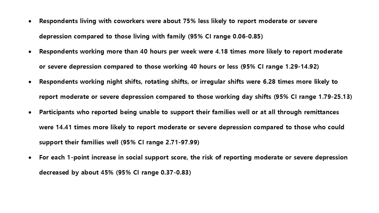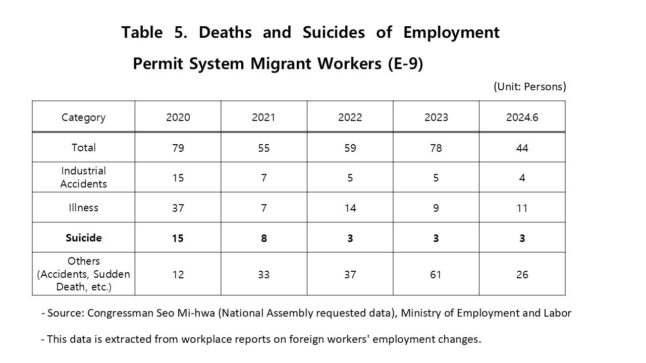 ❏ 가족과 떨어져 홀로 지내야 하는 외로움, 주변 동료나 사업주의 무관심 등 많은 원인으 로 인해 우울증과 자살 위험이 증가하는 원인으로 작용하고 있습니다.