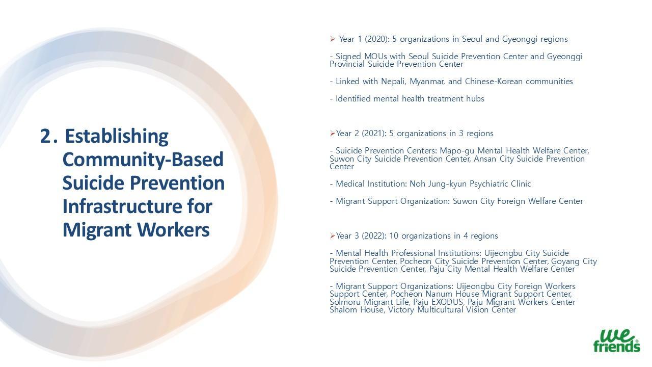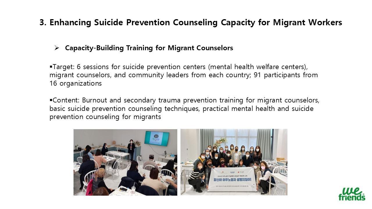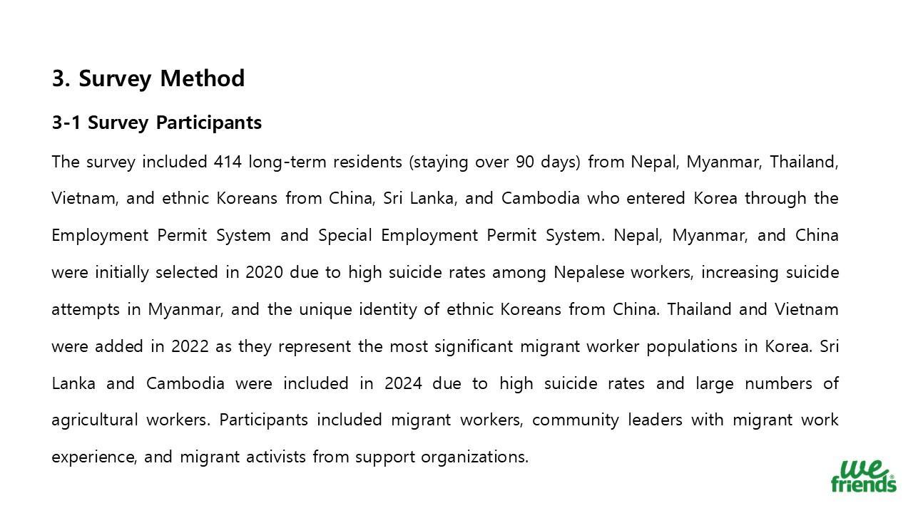 Migrant workers' role in our society's sustainability and economic development is increasingly important However, migrant workers sometimes reach a point of making desperate choices due to loneliness, isolation, language and cultural differences, and mental suffering caused by institutional discrimination Mainly, as we faced challenges such as healthcare accessibility issues, health inequalities, mental health deterioration, and suicide during the COVID-19 pandemic, wefriends has been actively conducting projects to promote mental health and prevent suicide among migrant workers since 2020. It is urgent to approach the suicide issue of migrant workers entering through the Employment Permit System not as an individual problem but as a social homicide caused by institutional issues and social discrimination.