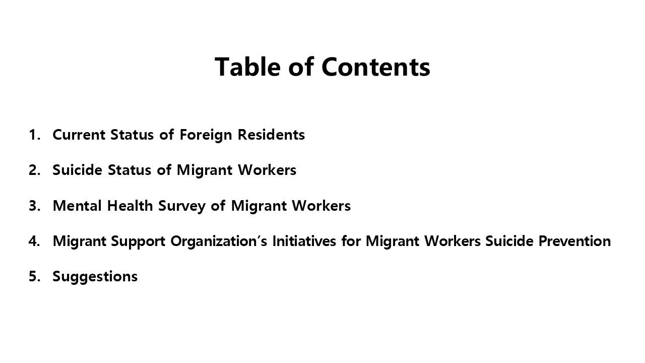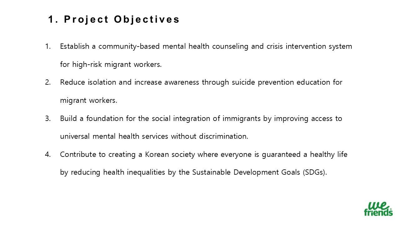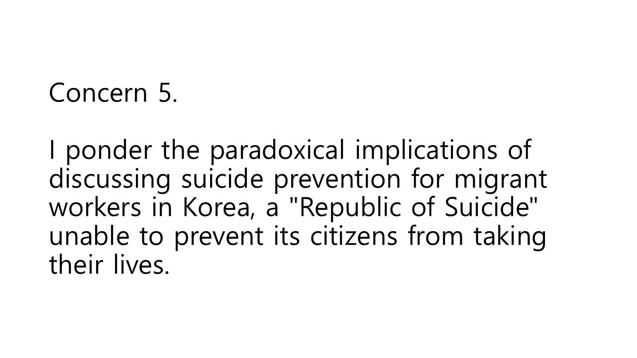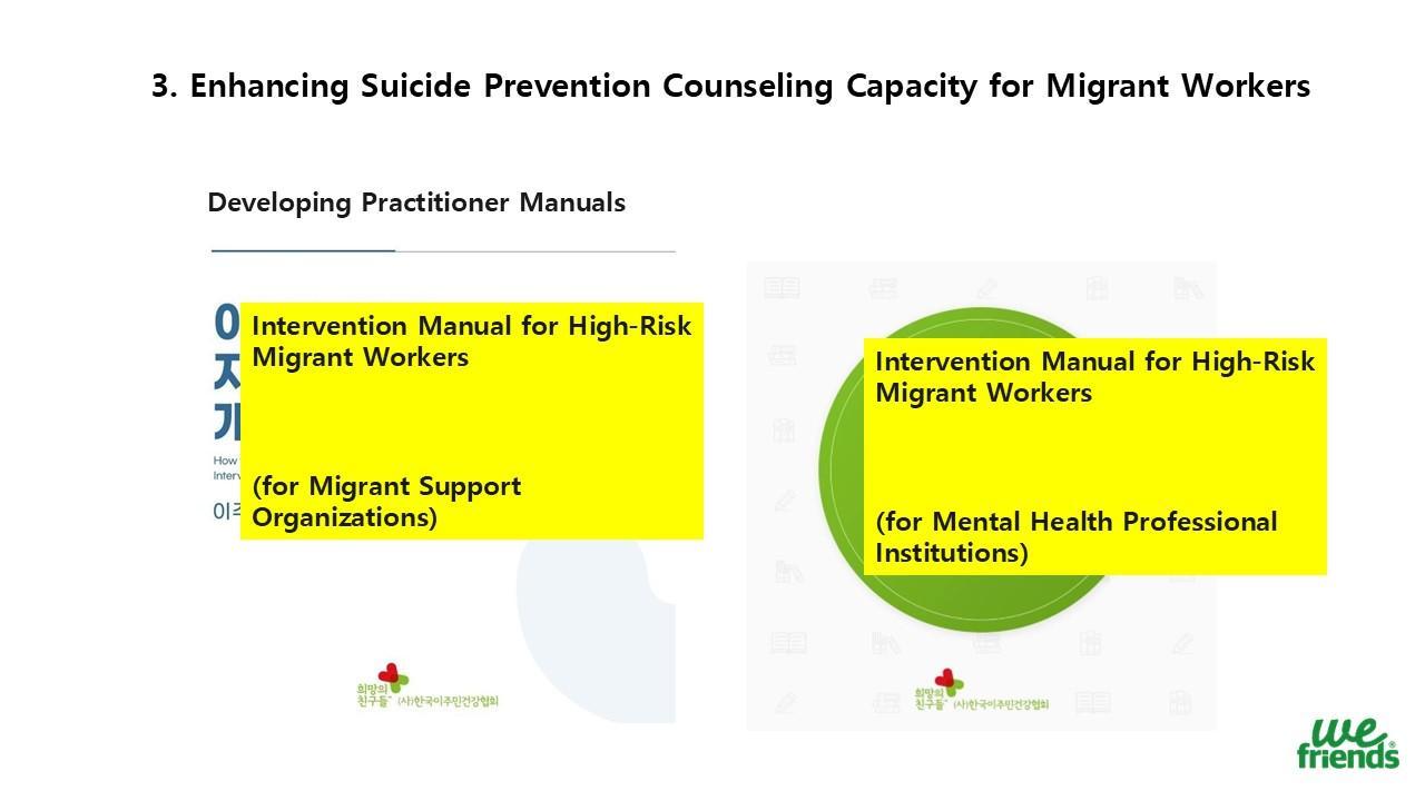Migrant workers' role in our society's sustainability and economic development is increasingly important However, migrant workers sometimes reach a point of making desperate choices due to loneliness, isolation, language and cultural differences, and mental suffering caused by institutional discrimination Mainly, as we faced challenges such as healthcare accessibility issues, health inequalities, mental health deterioration, and suicide during the COVID-19 pandemic, wefriends has been actively conducting projects to promote mental health and prevent suicide among migrant workers since 2020. It is urgent to approach the suicide issue of migrant workers entering through the Employment Permit System not as an individual problem but as a social homicide caused by institutional issues and social discrimination.