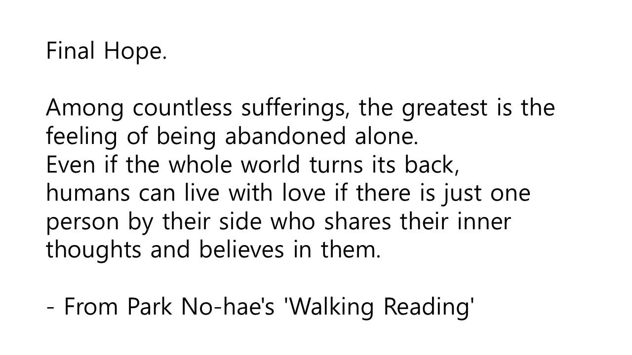 ‘너무 힘들 땐 모든 게 막막하고 앞이 캄캄해서 죽음밖에 해결 방법이 없다는 생각도 자 꾸 들었으나 가족과 같이 문제를 이야기하고 힘든 마음을 이야기하고 나니 위로가 되었습 니다 . 한국에 와서 일하는 이주노동자들이 나와 같은 어려움을 겪고 있는 사람들이 있다면 혼자라고 생각하지 말고 같이 이야기 나누고 혼자 있지 마세요.’