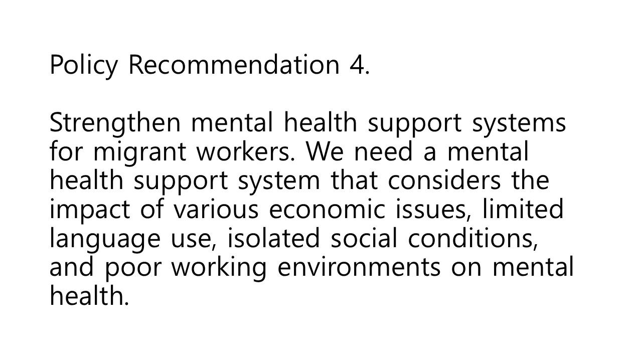 3. 정신적, 심리적 문제 발생 후 긴급하게 케어 할 수 있는 공간 및 담당 기관이 없어 정신 과적 위기 개입 방안이 마련되어야 하며, 이주민 우울증, 자살 관련하여 다국어 심리상담과 쉼터가 필요합니다