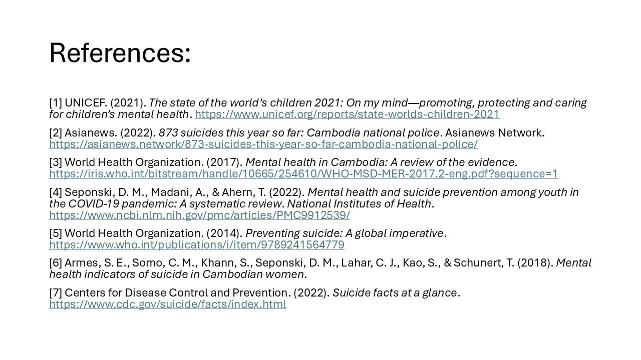 이것으로 제 발제를 마무리하며 이주노동자의 생명을 살리기 위한 자살 예방에 대해 이 포 럼에서 많은 논의가 이루어지길 바라며, 앞으로 타국에 있는 이주노동자들의 자살률이 감 소하길 바랍니다.