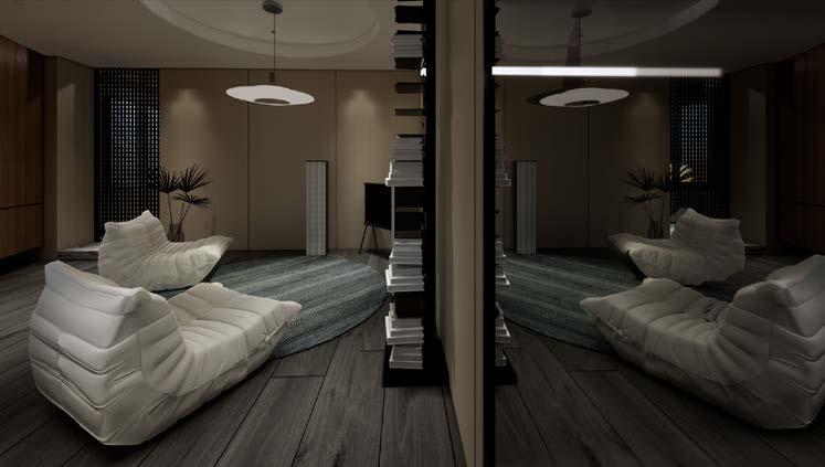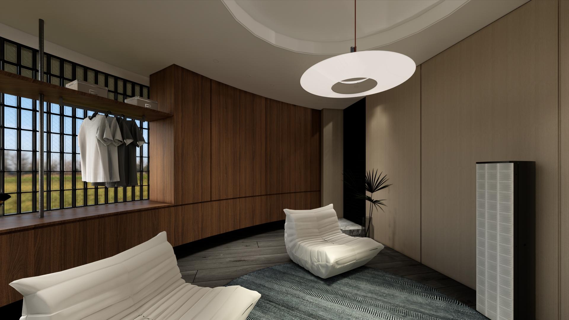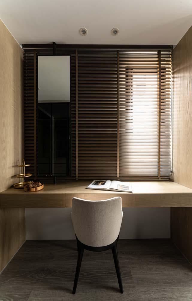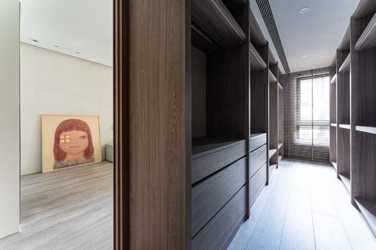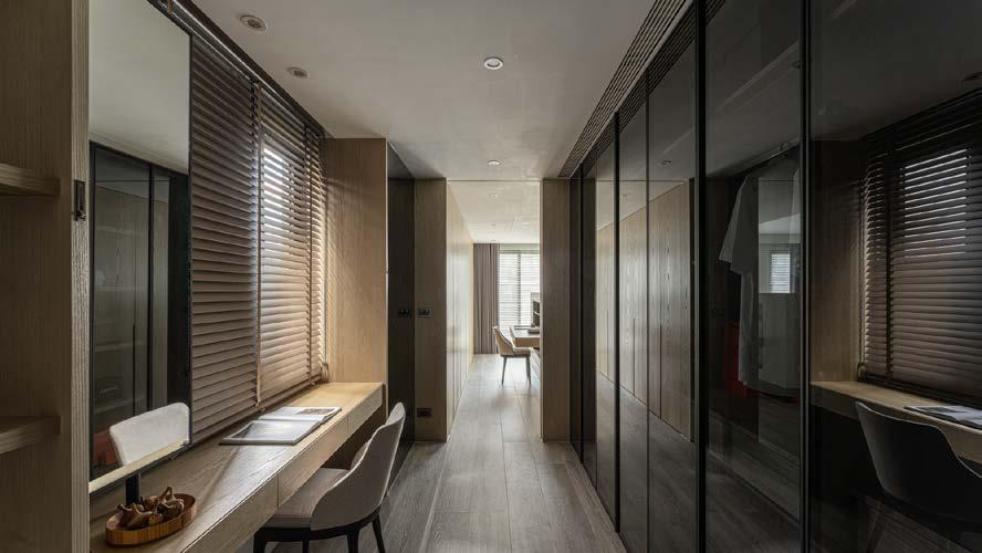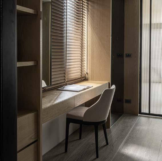 步入此空間,以柱深配置大面木作衣櫃,並順應基地呈 弧狀,半邊開口不做滿櫃,保留採光,下半作為梳妝檯面, 其餘空間作為休閒使用。
