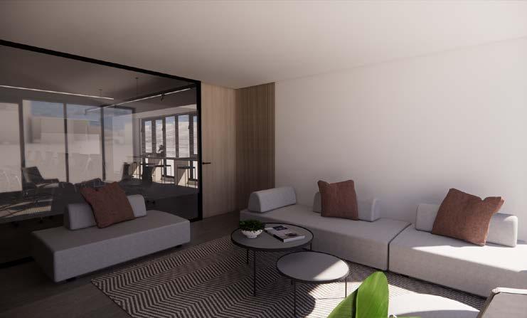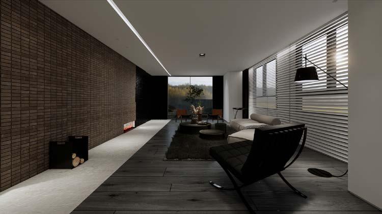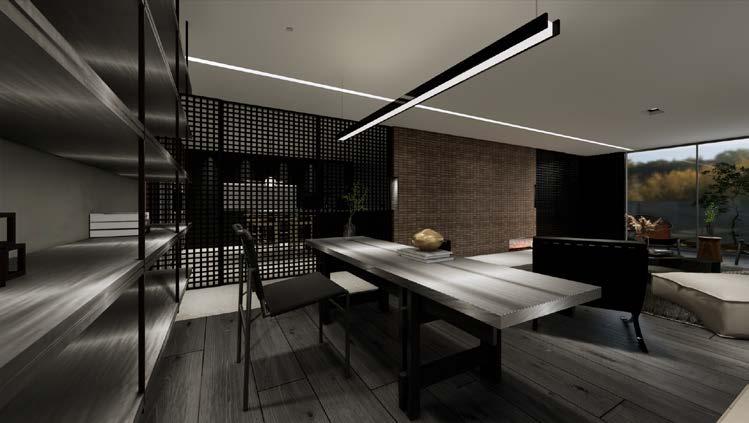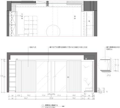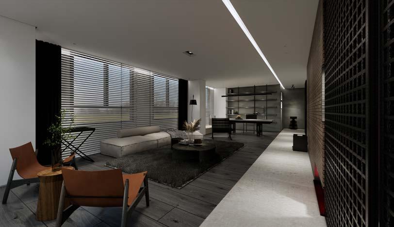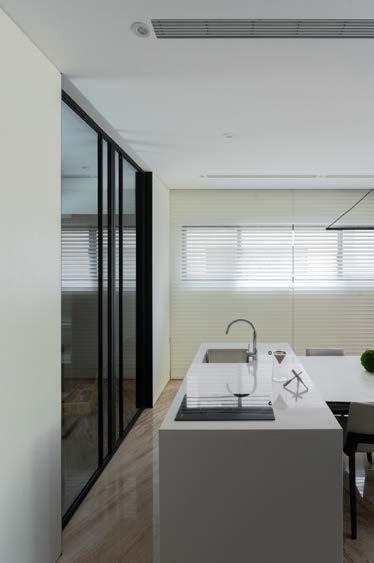 走廊過道做為劃分客廳與廚房的軸線,天花設計長條 間照與區域的照明設計搭配,電視牆兩側的格柵推拉 門隨著日昇日落做出光影變化。