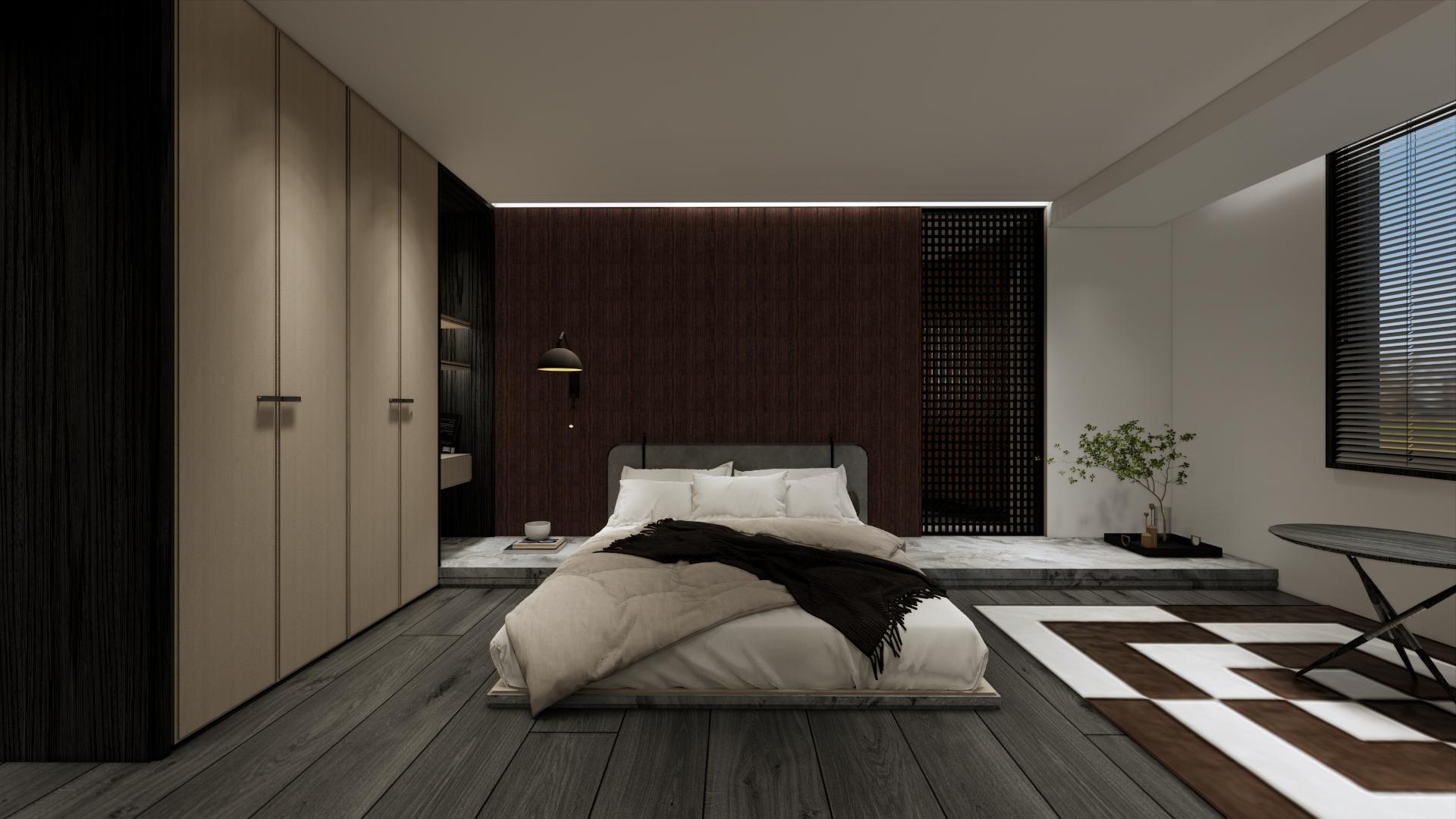 主臥床以木作結合石材形成床架與踏階高,床邊配置 外出服衣櫃,活動家具閱讀區,通往更衣室的門片以格 柵門的通透增加連結感。