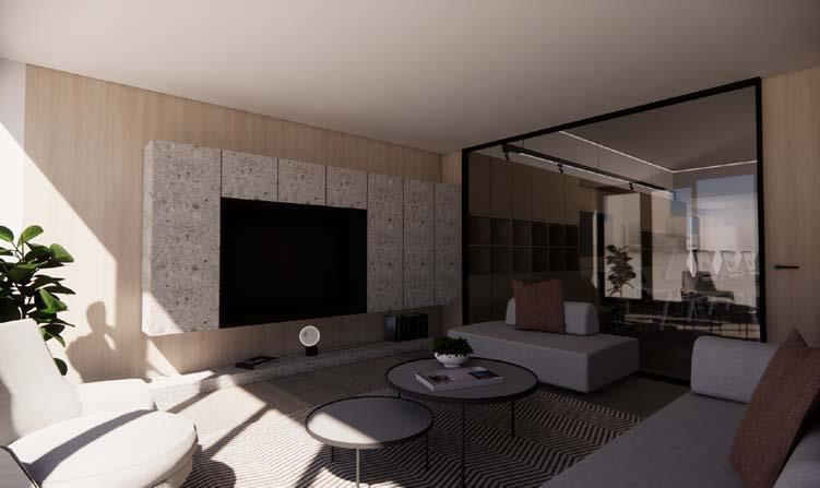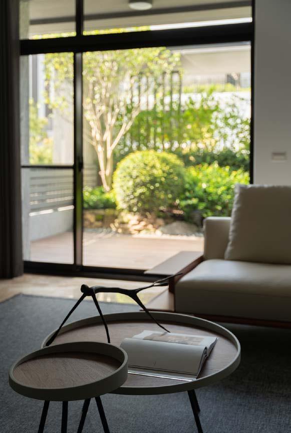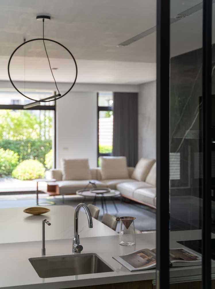 2樓層是全家生活的重心,中島望向客廳區有著絕佳 的綠意,石材,木皮染白,訂製家具等,所有的材質以平 光處理,不凸顯,不刻意,療癒也秩序。
