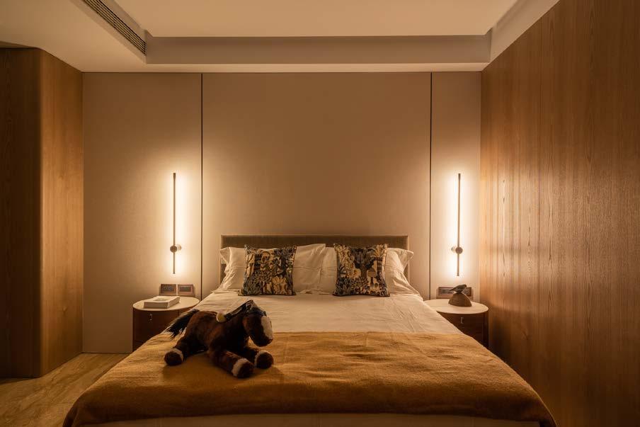 雙開主臥門片與床頭背牆貼上鐵刀木皮,與白橡木作 衣櫃及大面抽屜層板形成深淺層次,搭配照明讓視覺 有重點,亮度避免過與不及。