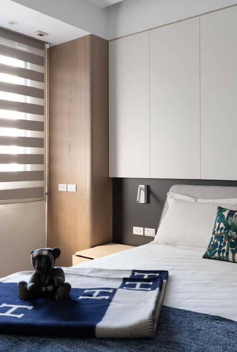 床頭柱角圓修飾,側牆貼上溫 潤的木皮,背牆是雅白的壁布, 1樓層玄關後方是業主長輩來 訪時入住的孝親房。