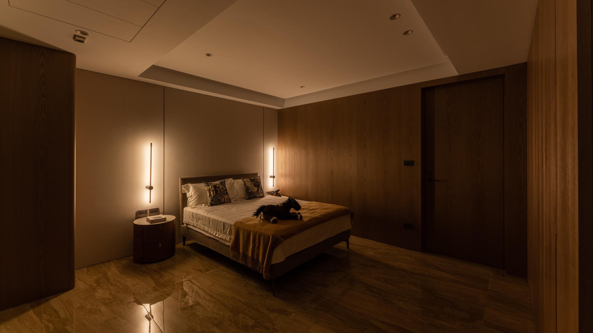 矮牆與超耐磨地板之間以黑色石材台階脫開,讓黑灰 色塊更有層次,床頭壁燈採一吊燈一壁燈豐富畫面。