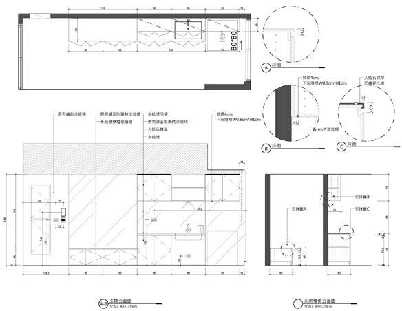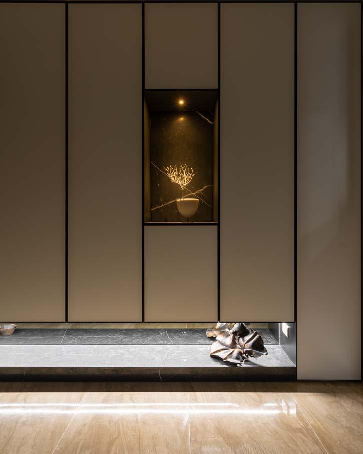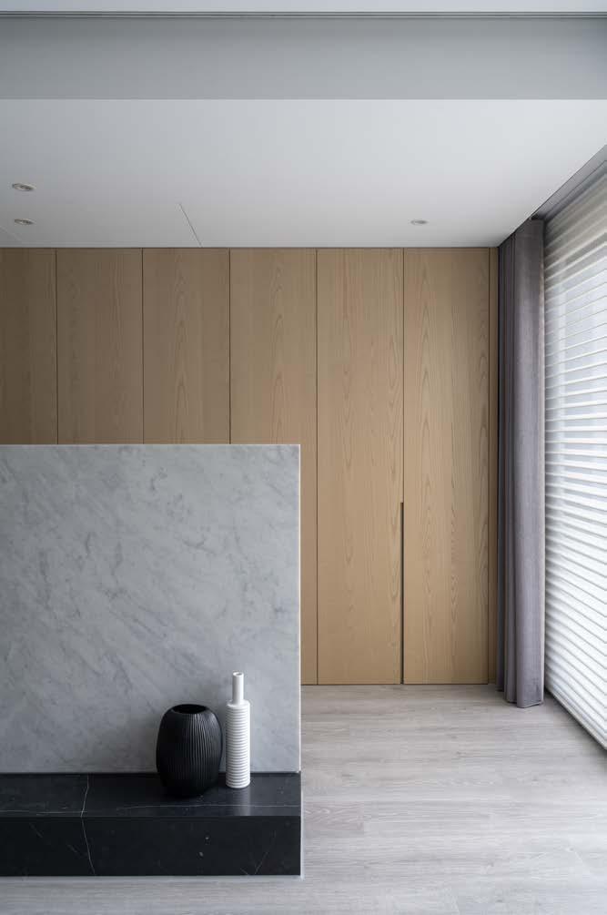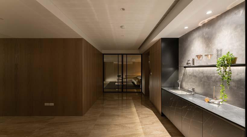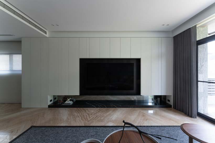 天花刷白拉長面增加寬闊感,端景特殊塗料與灰黑地 板拉高對比及重心,動線過道選擇米色系石材脫開地 板與立面,界線與間照相呼應。
