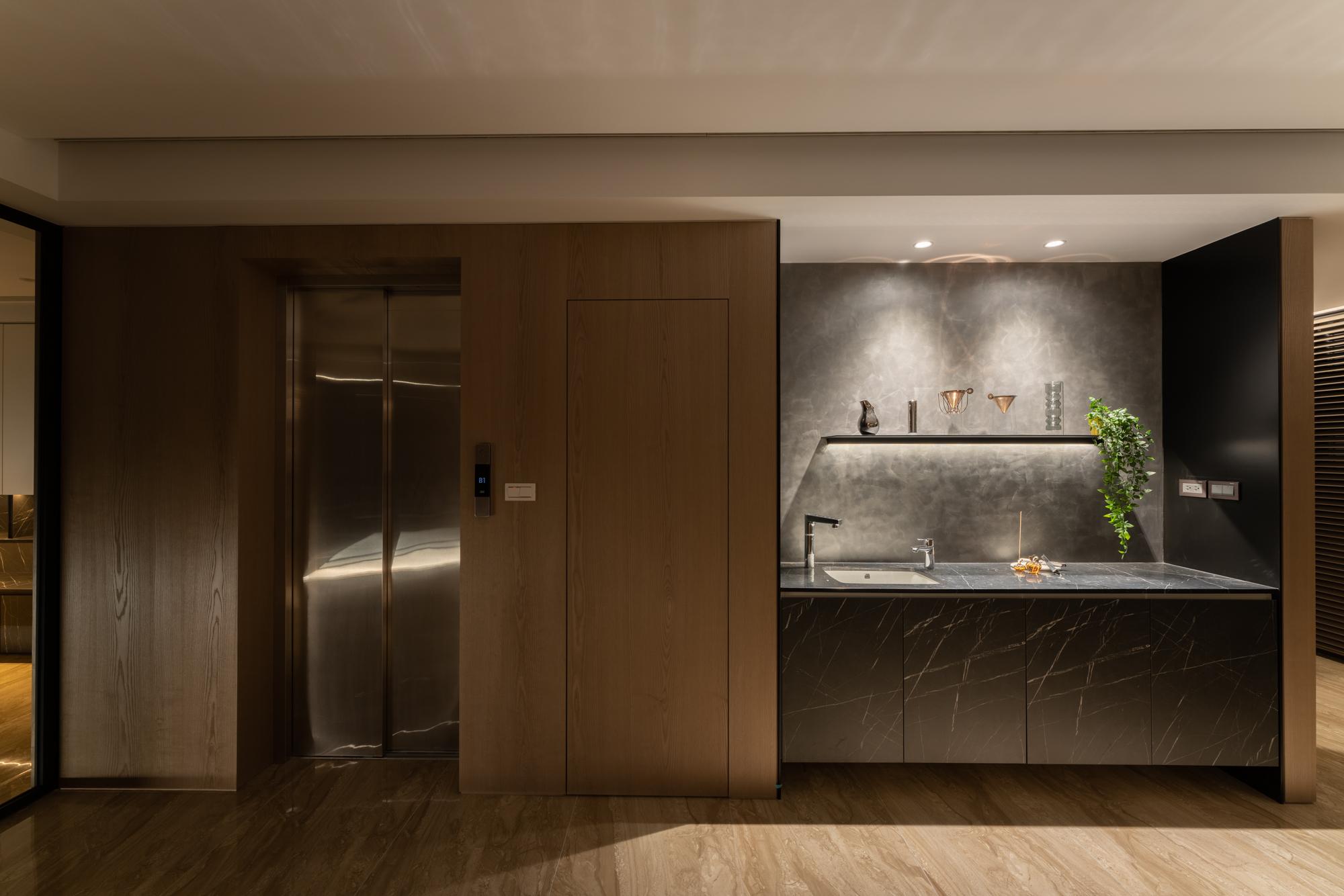 健身區配置了流理臺,在平日 或客人來訪時提供茶水,背牆 特殊漆的紋理成為另一種風景。