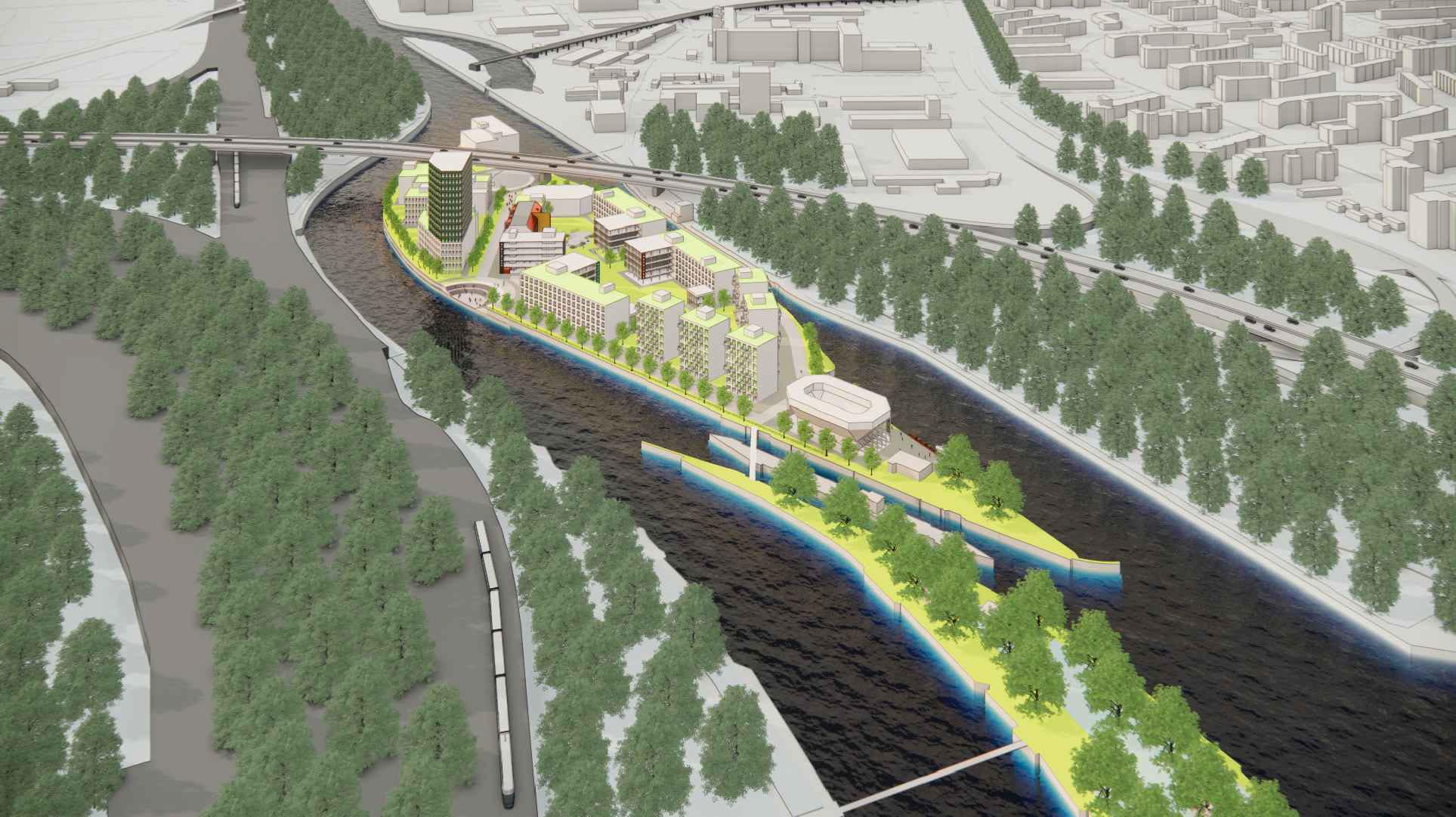 Uni-Insel, also known as the Green Campus of Siemenstadt, is a masterplan developed for a 5.3-hectare site located on the isolated Nonnendamm island in West Berlin. The island is situated in close proximity to the Siemenstadt industrial area in the northwest and a neighboring green island in the southeast. The site has been largely underutilized due to its difficult access and obstructed views caused by urban infrastructure such as a highway flyover, railway track, and river locks. Additionally, the absence of direct and walkable distance to subway or train stations within a 700-meter radius has limited its potential as a public destination.