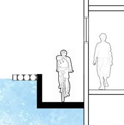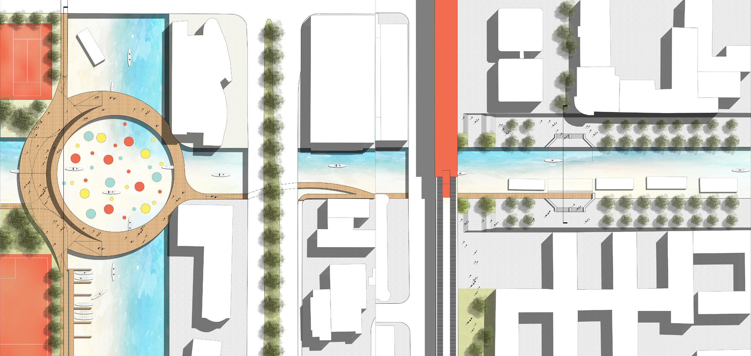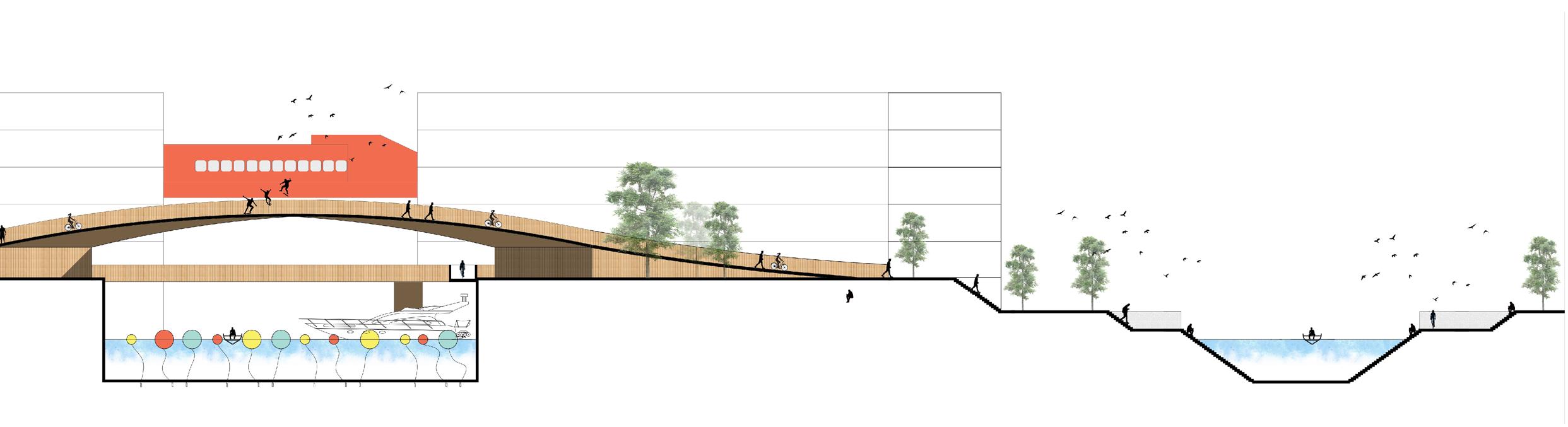 The journey starts from the quiet residential east area, developing along the canal to the climax at the intersection of Nordcanal and Hochwasser bassin, and recedes at the end. The design includes bike lanes along the river, extensions from the bridges, and green connections to neighboring stations and nodes to complete the urban scale design. Gathering spaces are also incorporated along the river to activate the hidden Bille river and reconnect the greens.