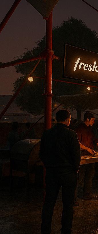 With the first layer complete, scaffolding is extended around the perimeter of the designated stage area. This outer frame defines the boundary of the event space, while the team begins planning the interior — deciding how the central platform will operate depending on the type of programme (fire drill, performance, civic event).