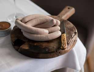 Eine Legende aus dem Hause Döllerer. Zartes Kalbsbrät, fein gewürzt mit Ingwer, Muskatnuss, Salz, weißem Pfeffer, Zitrone und Zwiebel. So delikat wie bekömmlich. In heißem Wasser erhitzt und klassisch mit Döllerers Hausmachersenf oder einem Glas Champagner serviert.