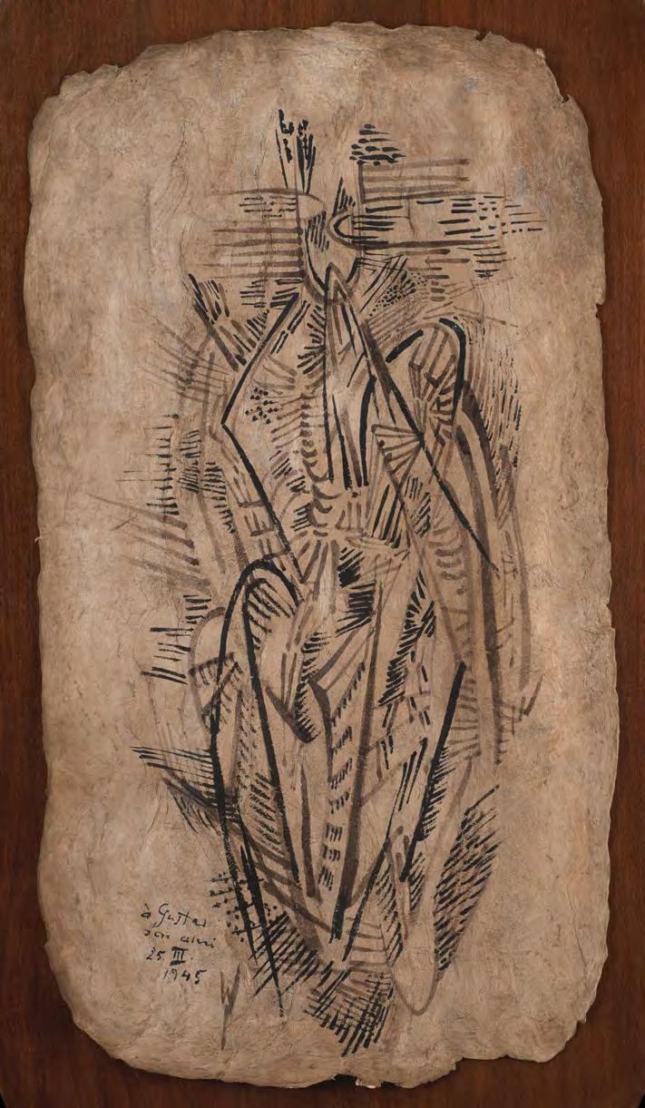 Discord between Paalen and Matta about the conception of Surrealist pictorial space. Matta plans a competitor journal to DYN in New York and workshops with Motherwell, Pollock, Lee Krasner, Fritz Bultmann, William Baziotes, and others; Matta demonstrates the fumage technique. Paalen creates chromatic, mosaic-like “picture beings.” Preliminary notes for The Beam of the Balance, a visionary play about a young couple that, along with Doctor Faustus, sets out for the utopian city of EO; a reckoning with political totalitarianism. Paalen’s collection of totem art from British Columbia is shown in San Ángel. Publication of DYN 4–5 with the influential essay “Totem Art.”