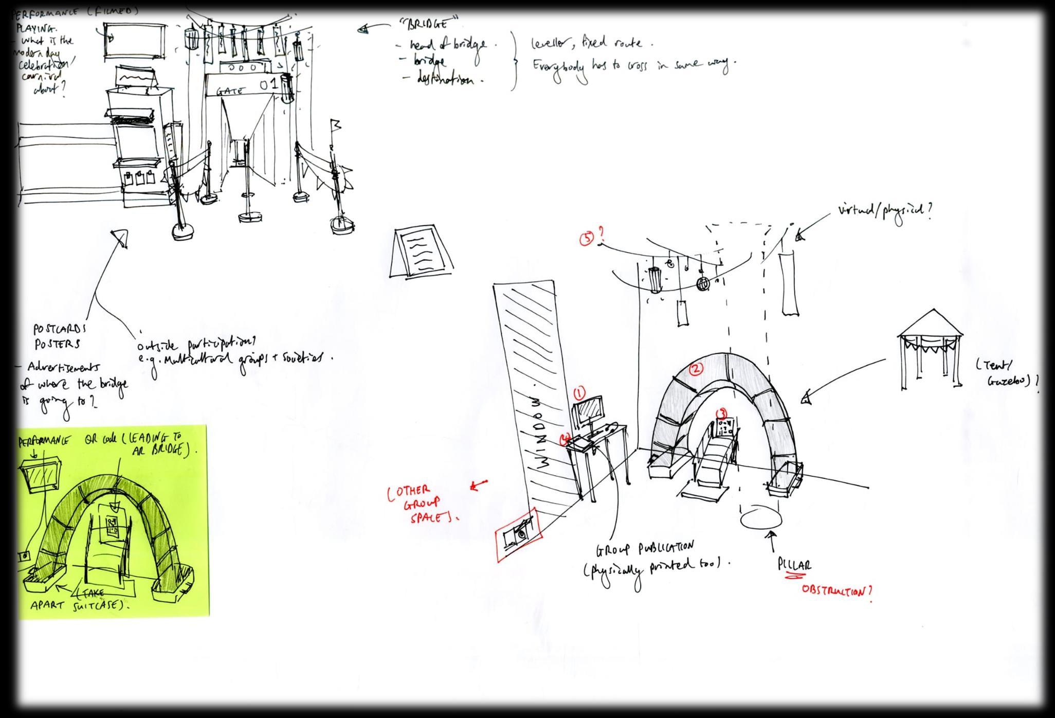 -this is to fit the elements of our mostly performance- based exhibition in the F block gallery space -the location is ideal, and consciously chosen to be the walkway, entering the exhibition space proper: it resembles a bridge, while the skylight invokes the aspects of an airport terminal's lounge